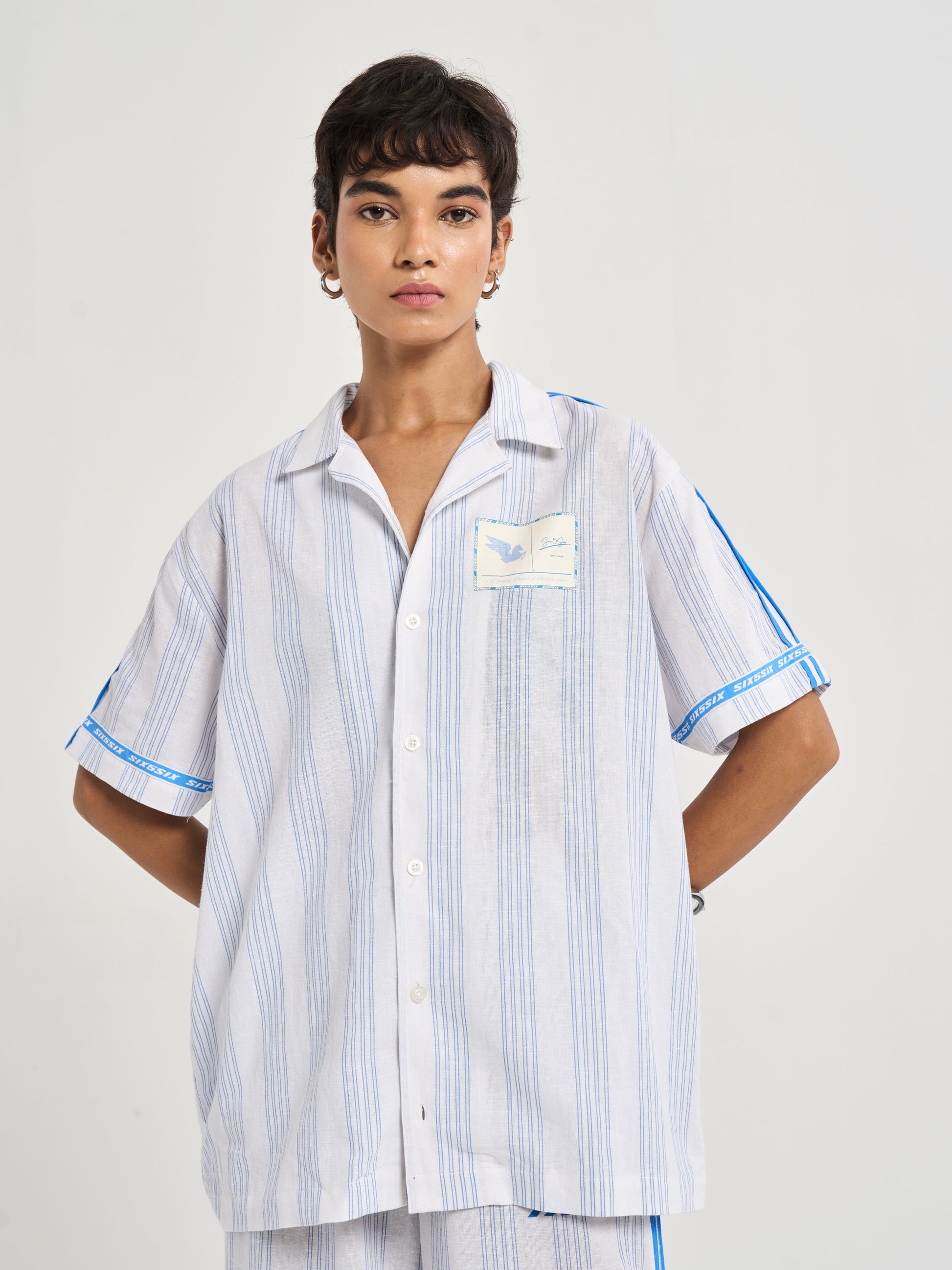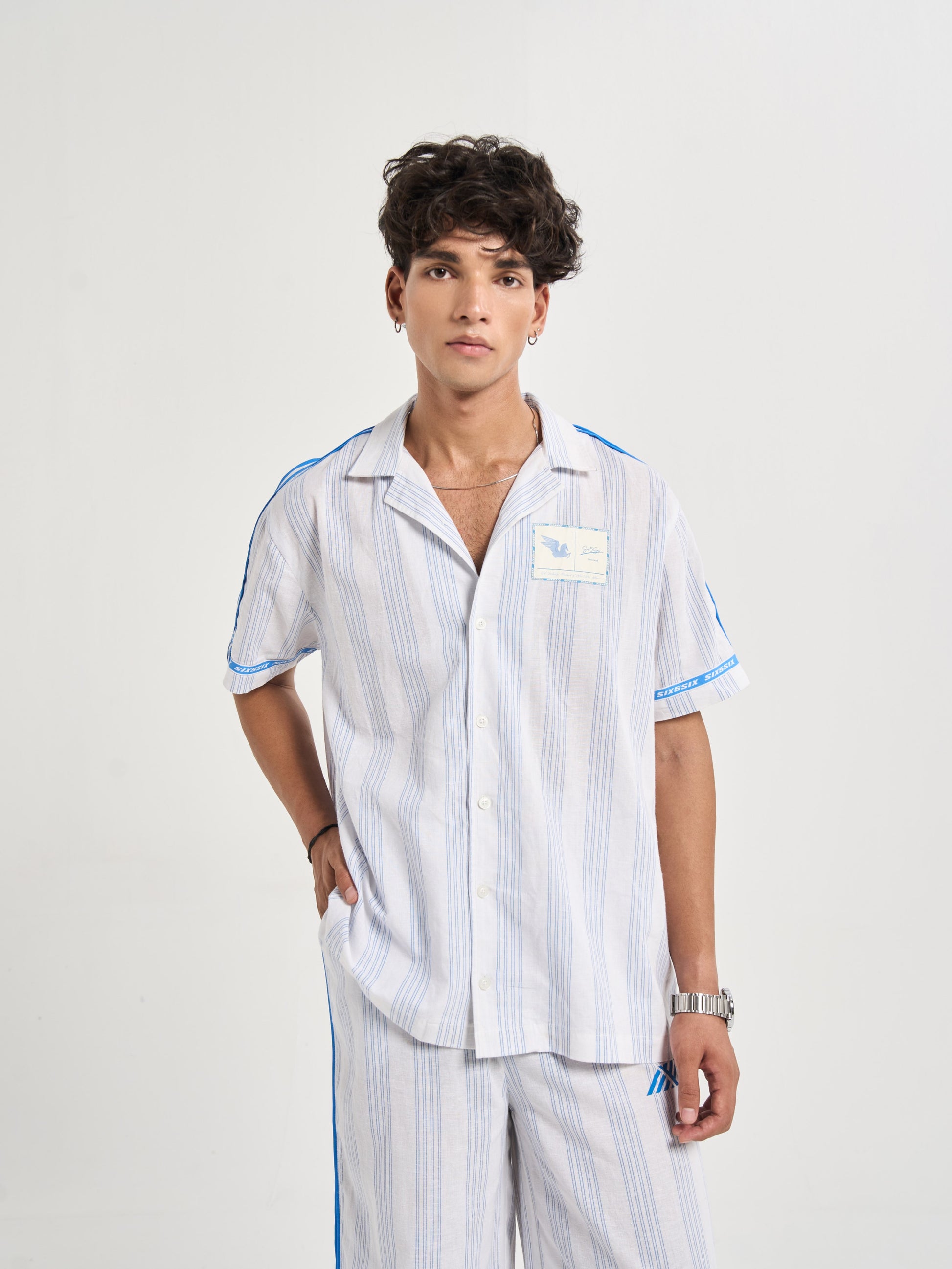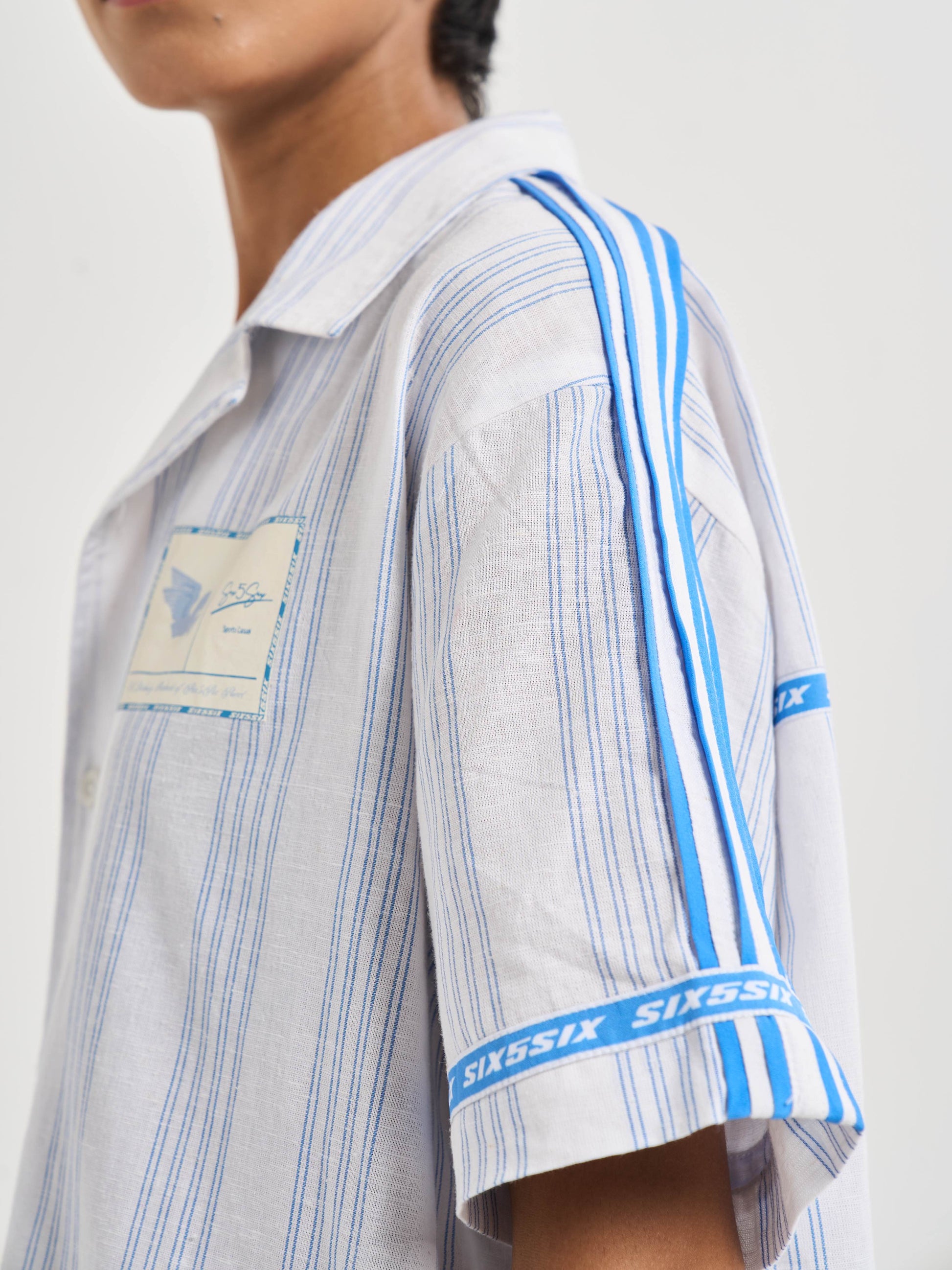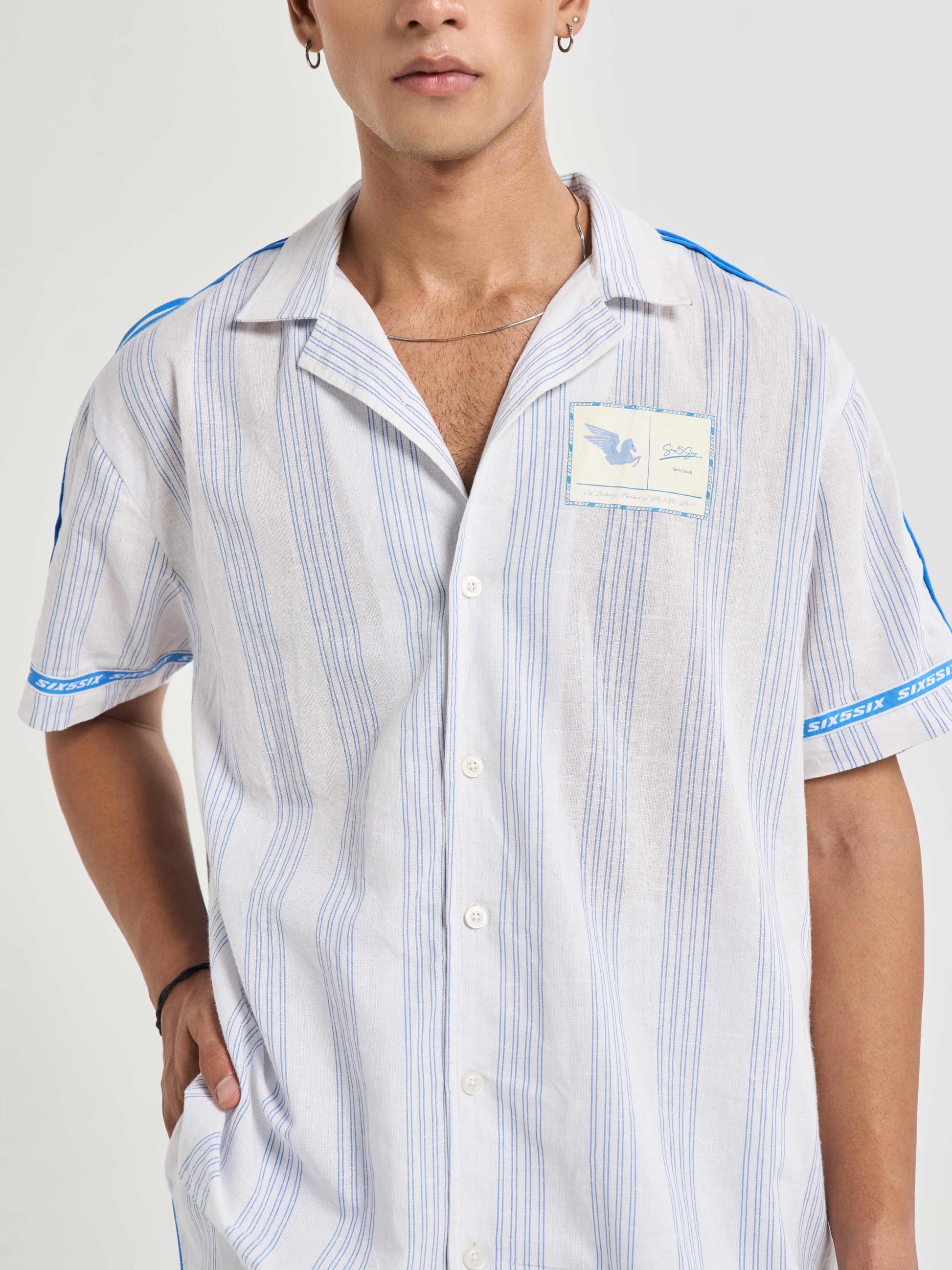 A relaxed half-sleeve shirt cut from milk-white cotton-linen detailed with blue pinstripes for crisp tailored feel. the chest carries pegasus six5six patch symbol of motion and aspiration. along shoulders flat poplin piping mirrors stripe color while circular branding around sleeve hems back yoke recalls finish heritage woven tailoring. on striped heart emblem radiates monogram centering logo within refined crest-like motif. casual yet sophisticated it bridges vintage summer tailoring modern resort ease..