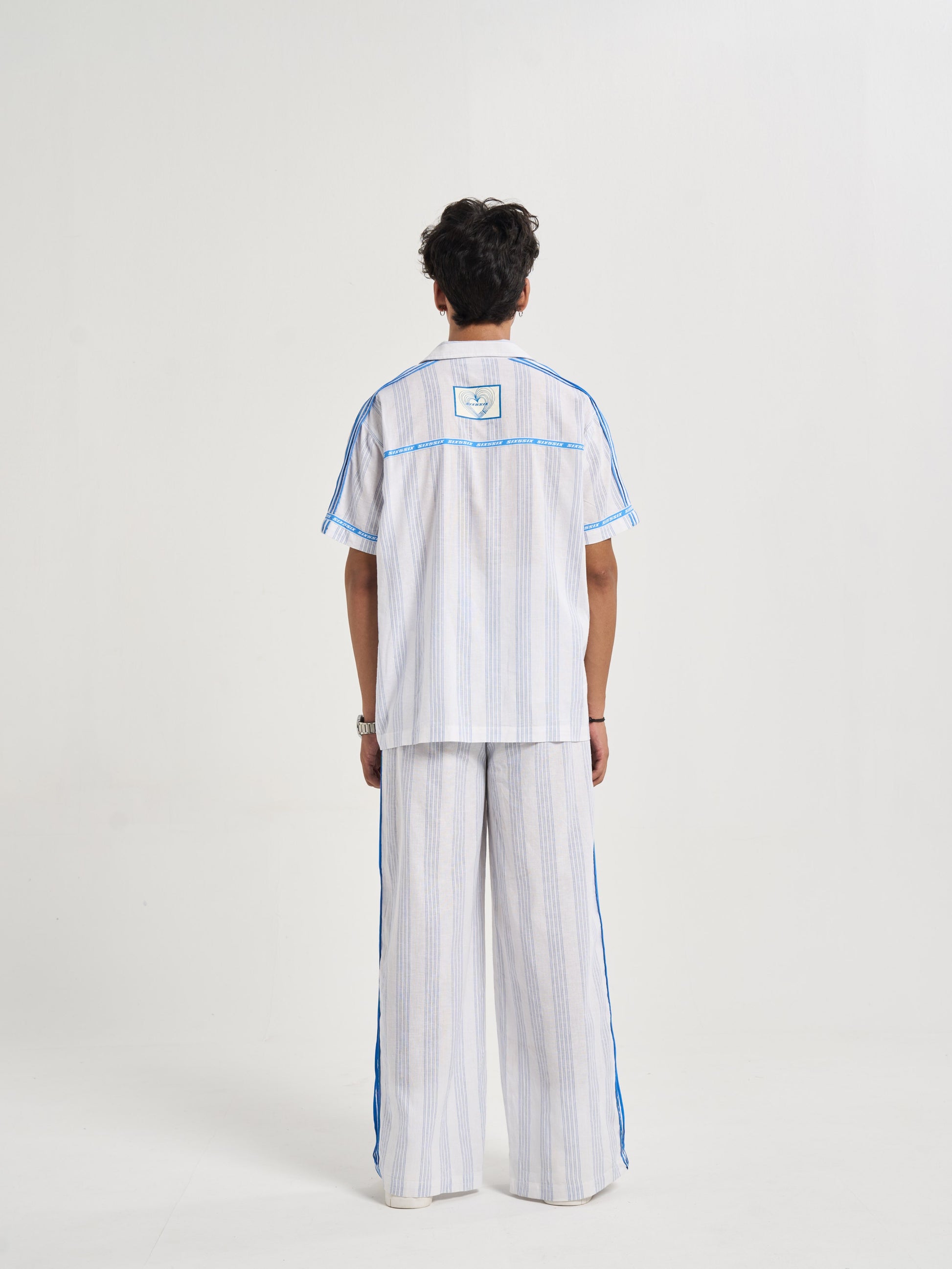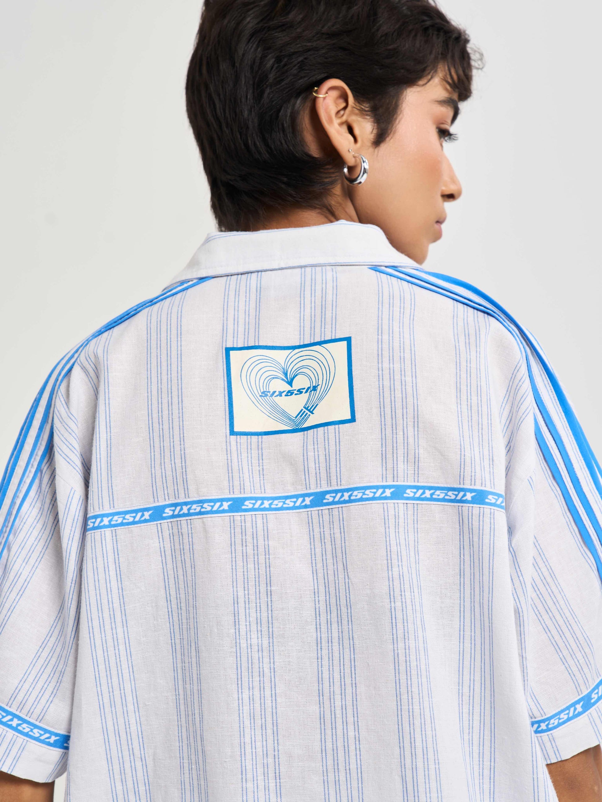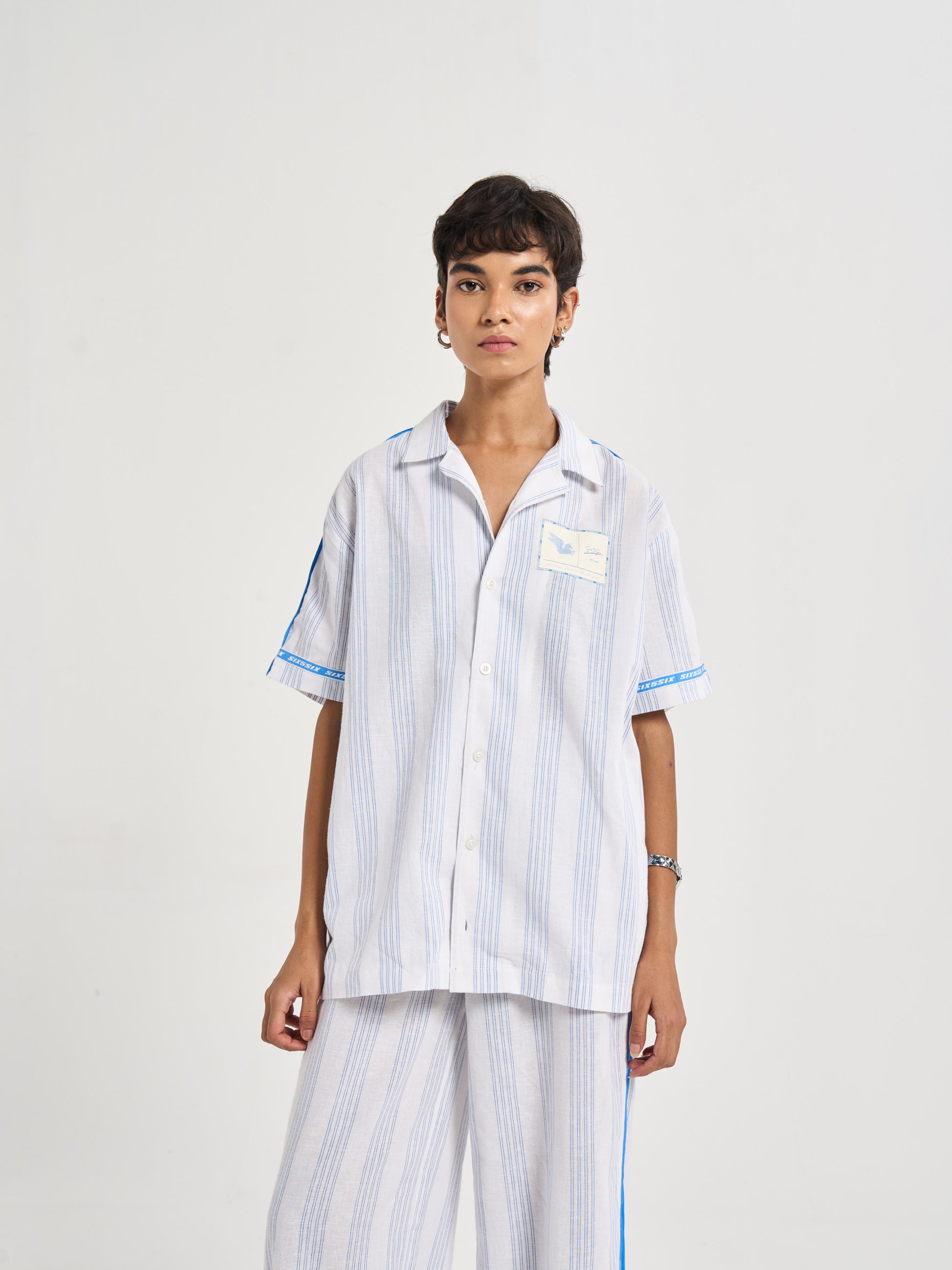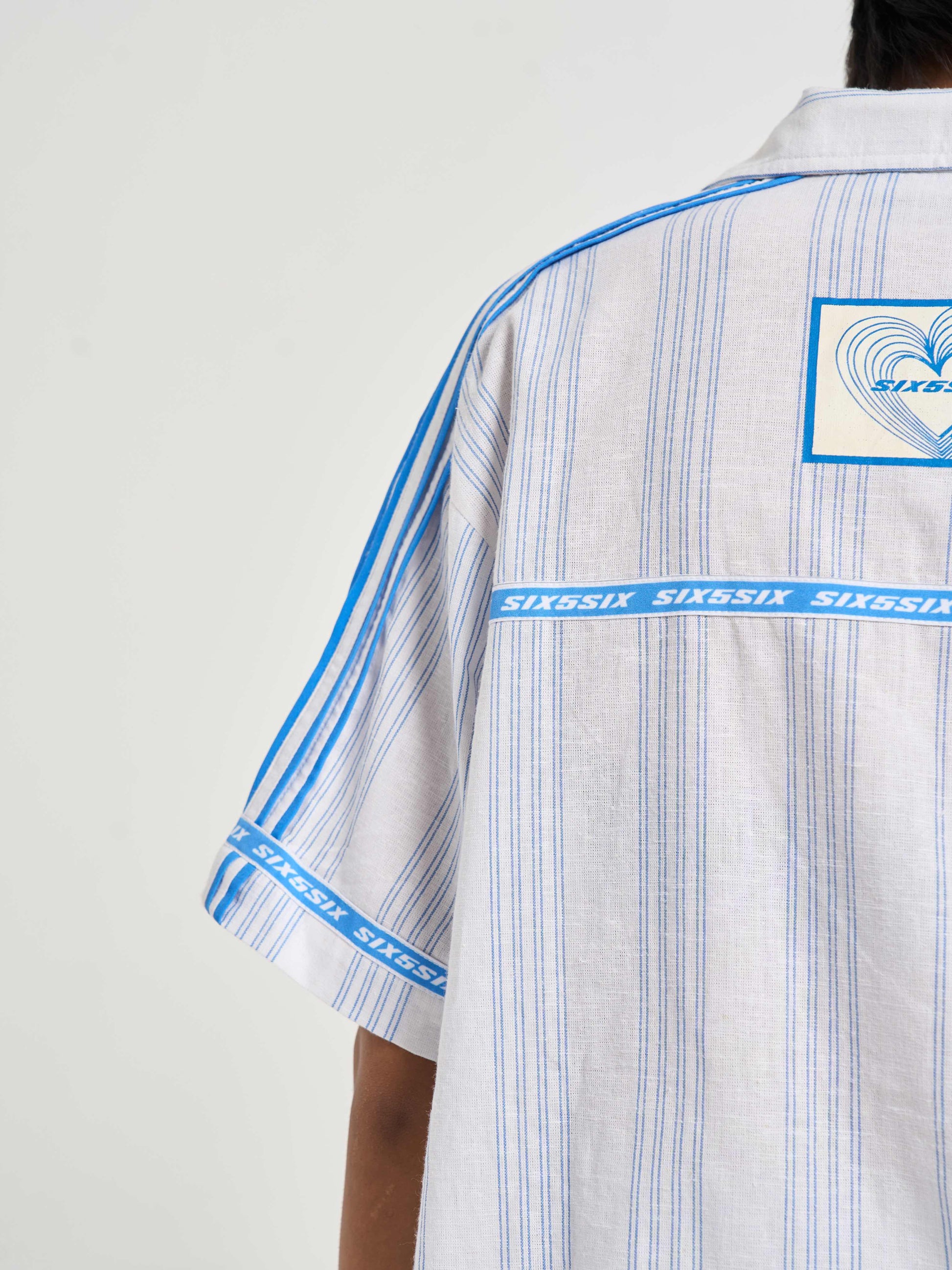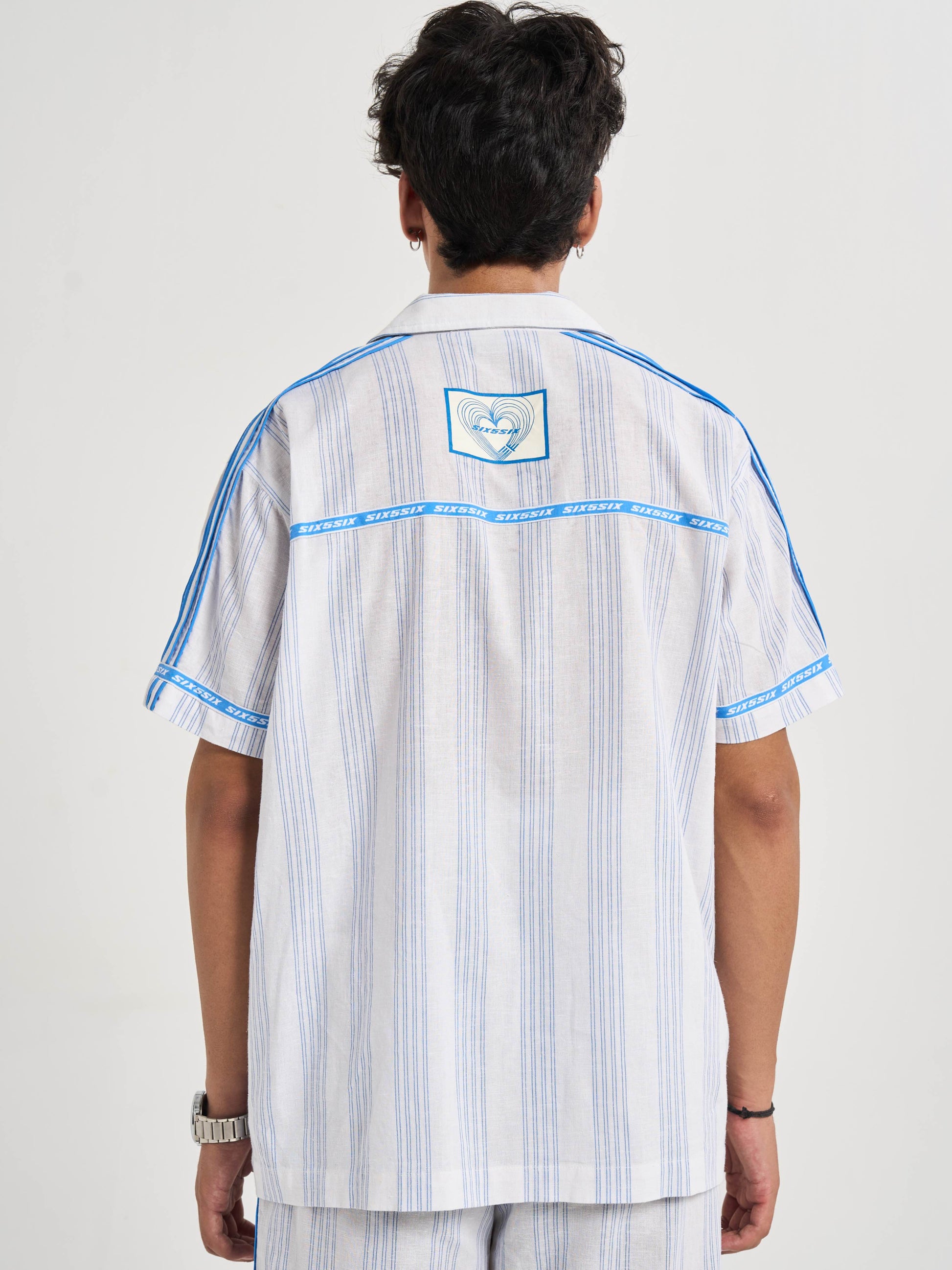 A relaxed half-sleeve shirt cut from milk-white cotton-linen detailed with blue pinstripes for crisp tailored feel. the chest carries pegasus six5six patch symbol of motion and aspiration. along shoulders flat poplin piping mirrors stripe color while circular branding around sleeve hems back yoke recalls finish heritage woven tailoring. on striped heart emblem radiates monogram centering logo within refined crest-like motif. casual yet sophisticated it bridges vintage summer tailoring modern resort ease..