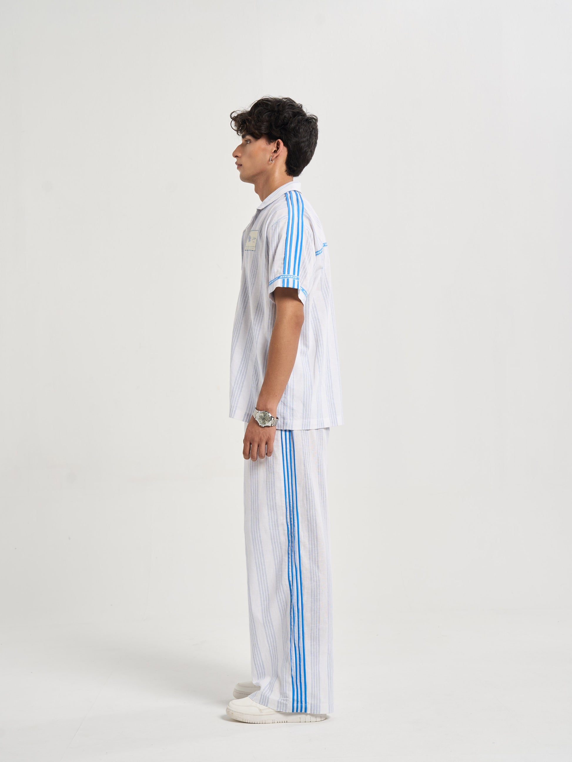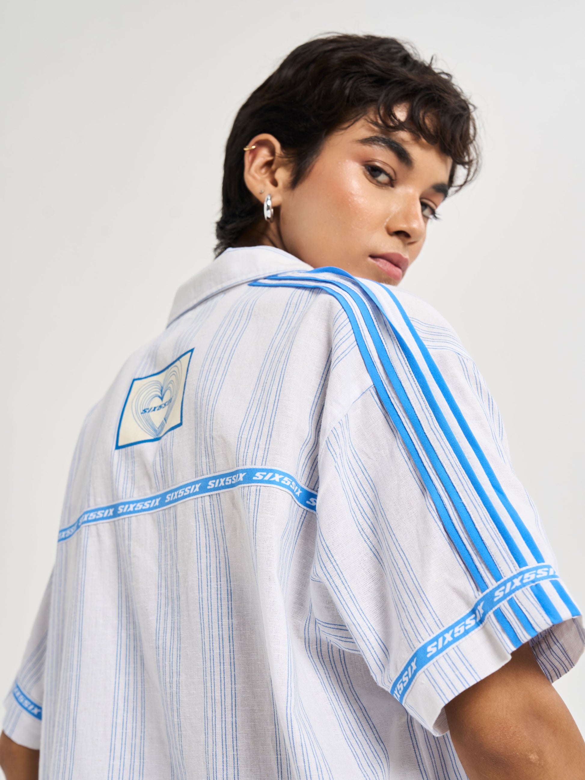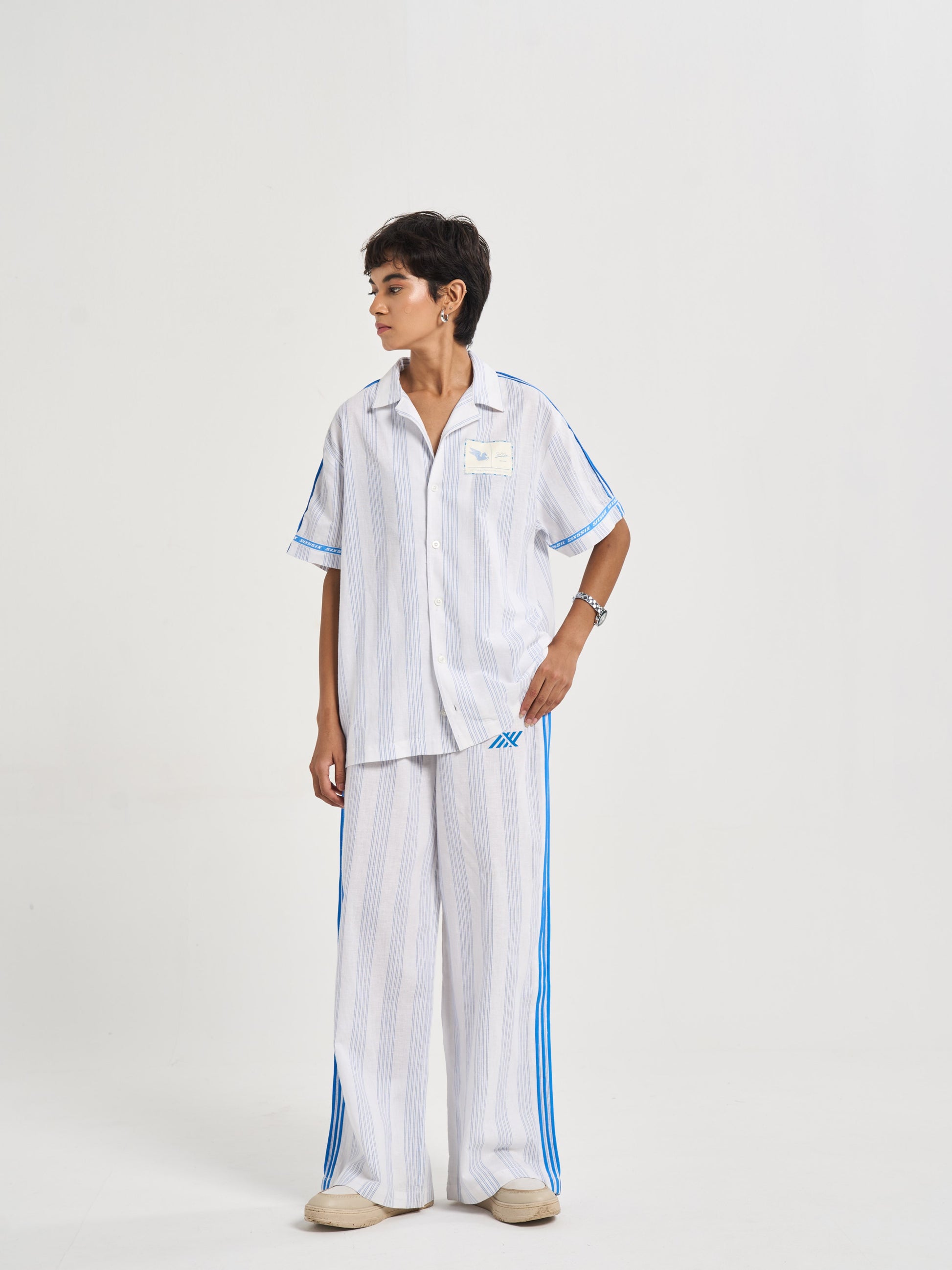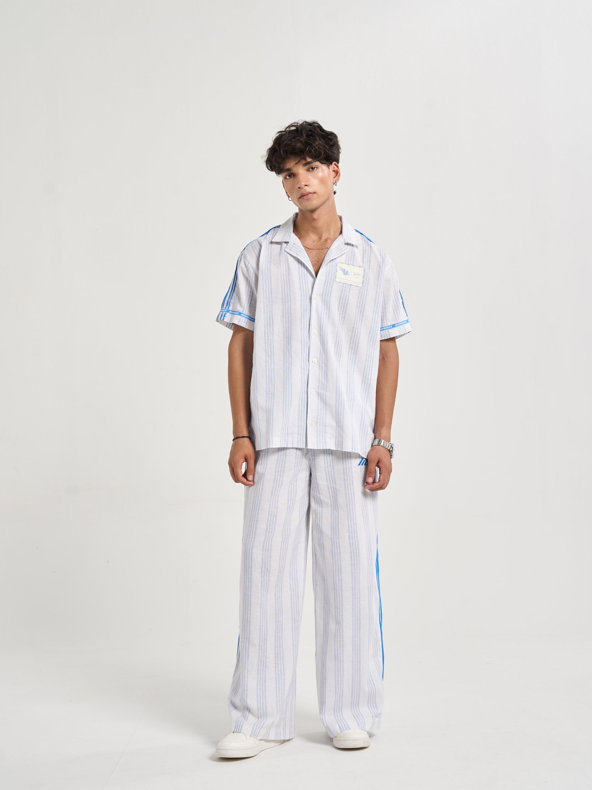A relaxed half-sleeve shirt cut from milk-white cotton-linen detailed with blue pinstripes for crisp tailored feel. the chest carries pegasus six5six patch symbol of motion and aspiration. along shoulders flat poplin piping mirrors stripe color while circular branding around sleeve hems back yoke recalls finish heritage woven tailoring. on striped heart emblem radiates monogram centering logo within refined crest-like motif. casual yet sophisticated it bridges vintage summer tailoring modern resort ease..