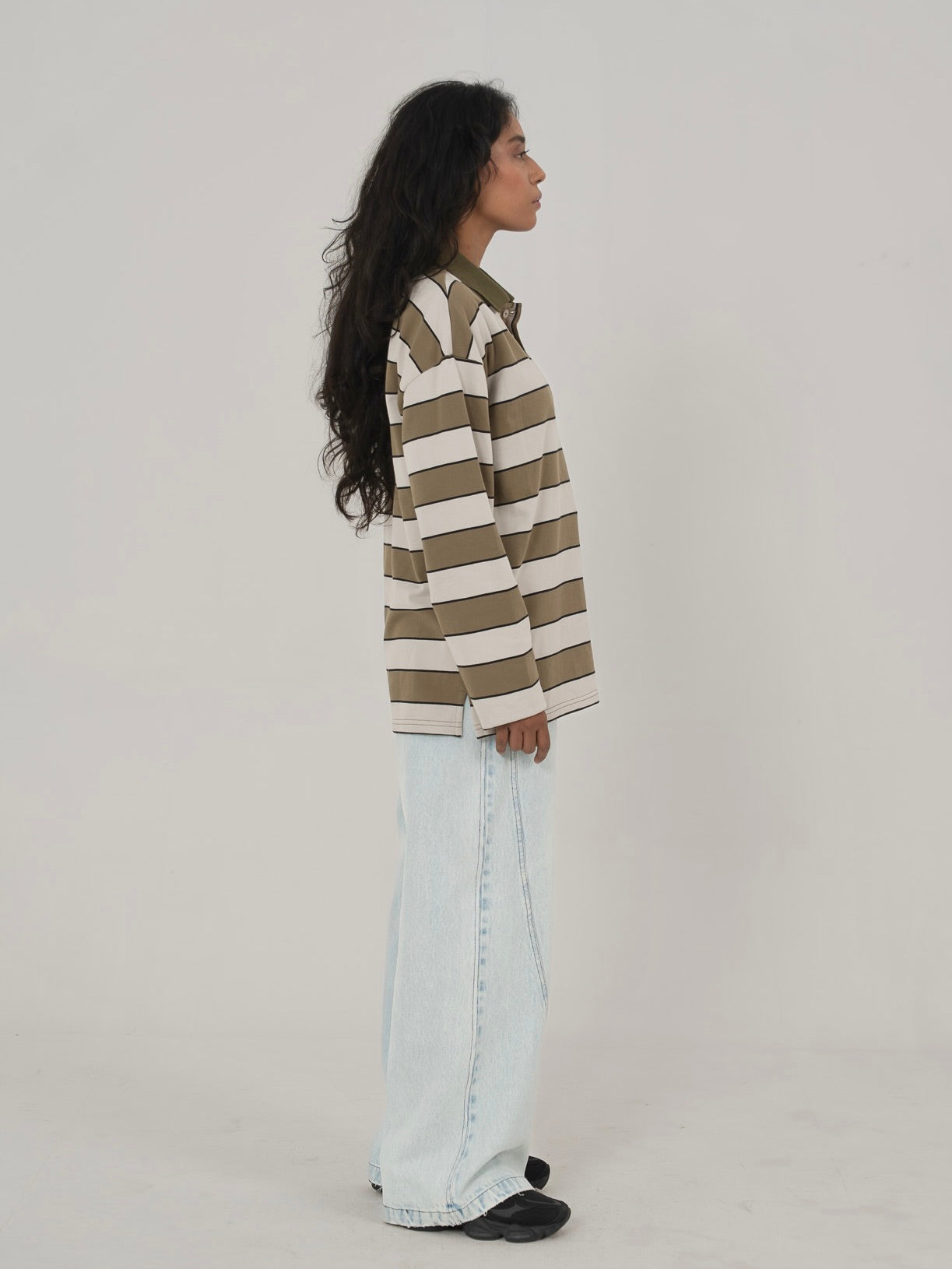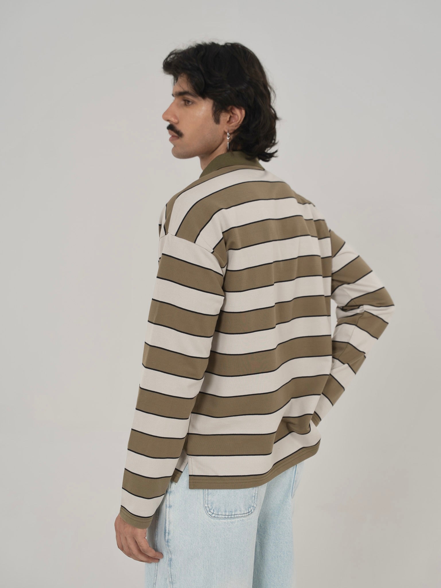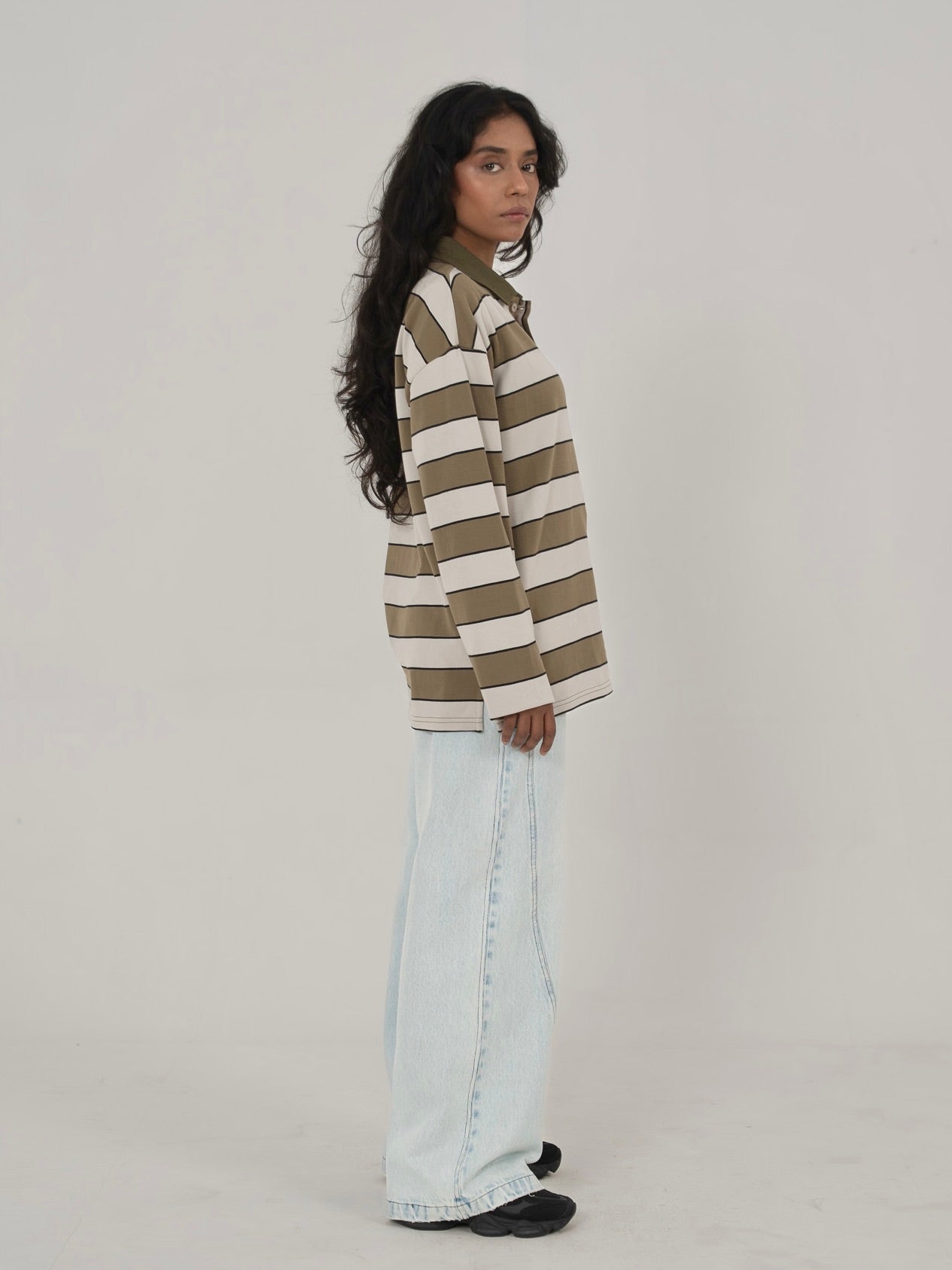 A refreshed take on our signature striped polo; now featuring SIX5SIX Athletic Club embroidery in soft silk thread across the chest. Crafted from medium cotton terry, it carries forward the same relaxed, boxy fit and wide stripe layout that made the original a wardrobe staple. The colour combination brings a heritage sports undertone while keeping the mood easy and wearable.This version balances vintage athletic energy with modern casual comfort; a timeless everyday piece that feels elevated yet effortless.