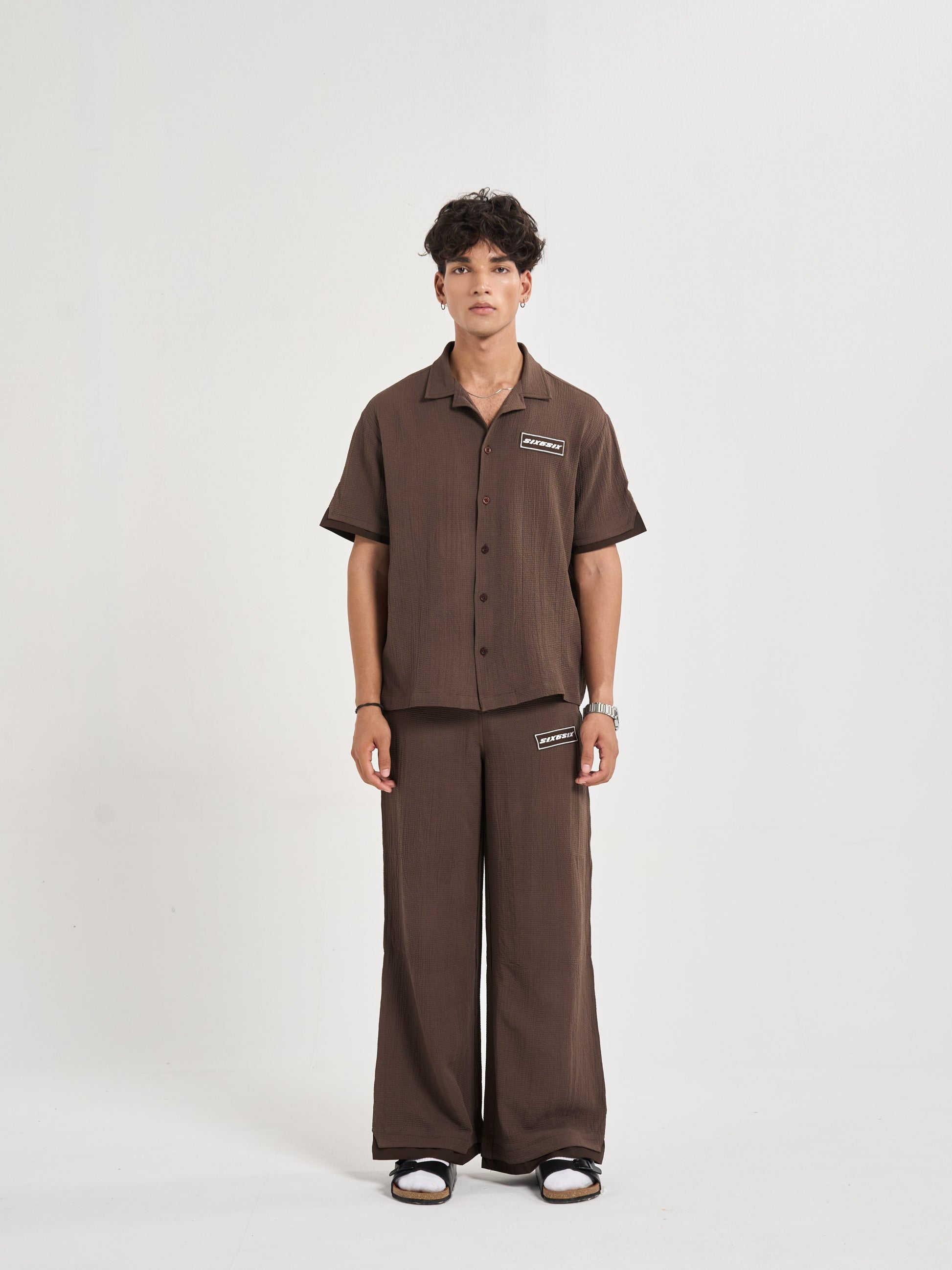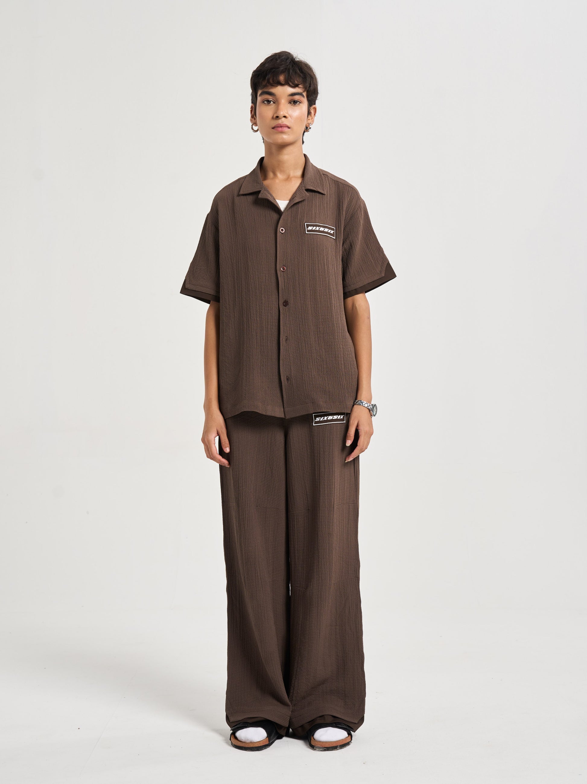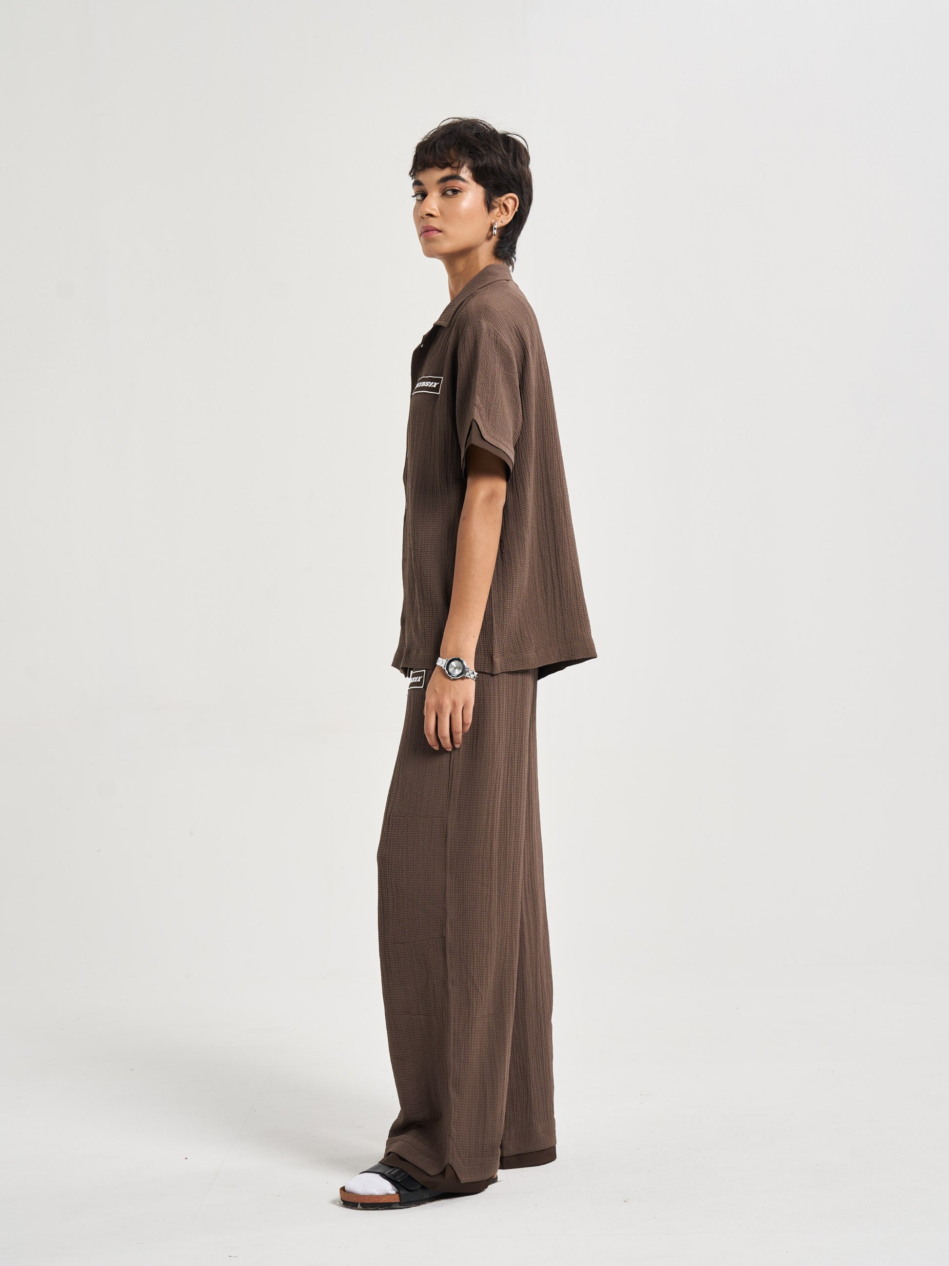 Baggy, semi-elasticated trousers cut from the same sand-inspired raised texture fabric, translating the rhythm of grains into a relaxed drape. The metal 656 branding adds polish to the flow, balancing casual comfort with elevated detail. These trousers embody the idea of movement within stillness, simple, versatile, and refined, like the endless repeat of sand patterns at shore or desert. .