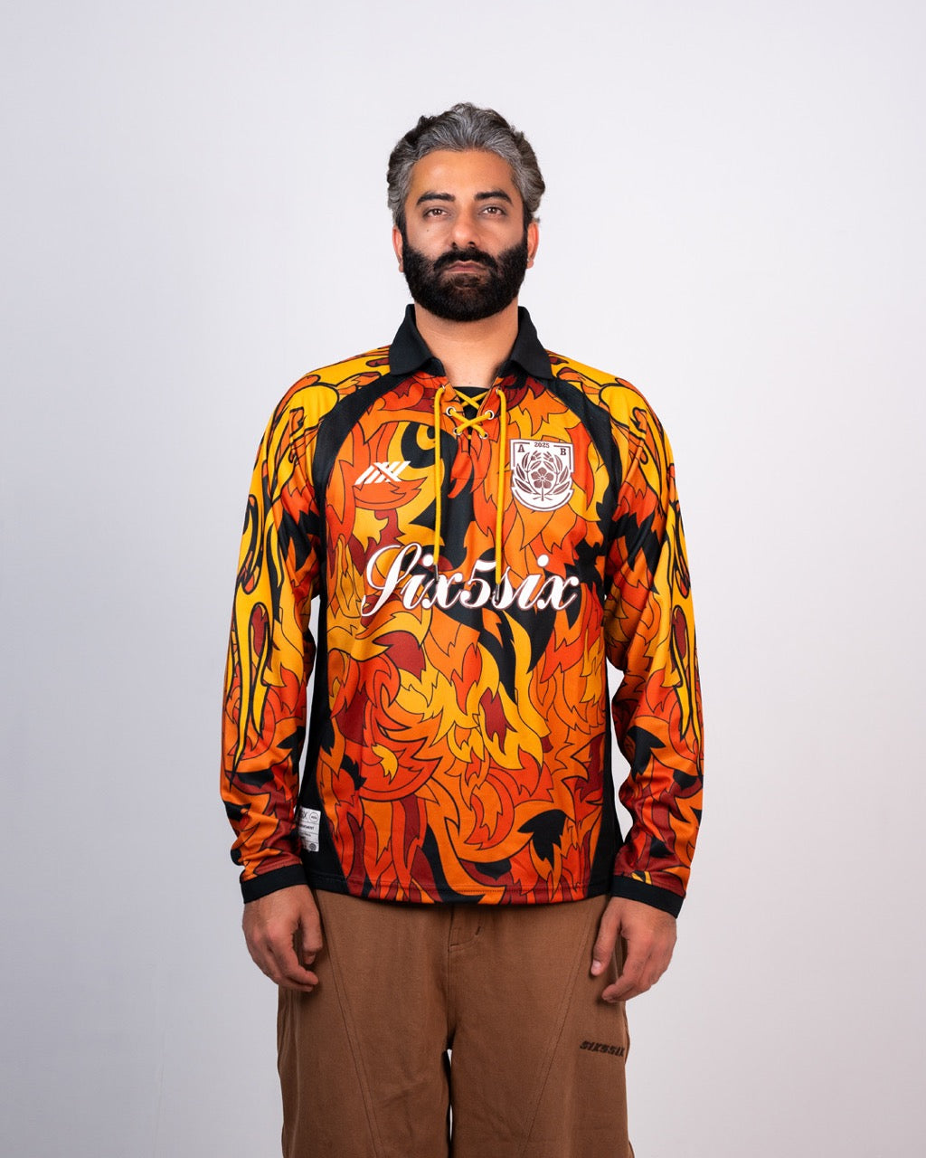 The Kaen Football Jersey ignites the pitch with fierce yellow flame graphics that ripple across a black and amber base. Inspired by the Japanese word for flame, the design embodies movement, heat, and raw attacking energy. Inspired by Aditya Bhalla's personal style and tattoos, the jersey blends anime nostalgia with contemporary street-sport aesthetics.