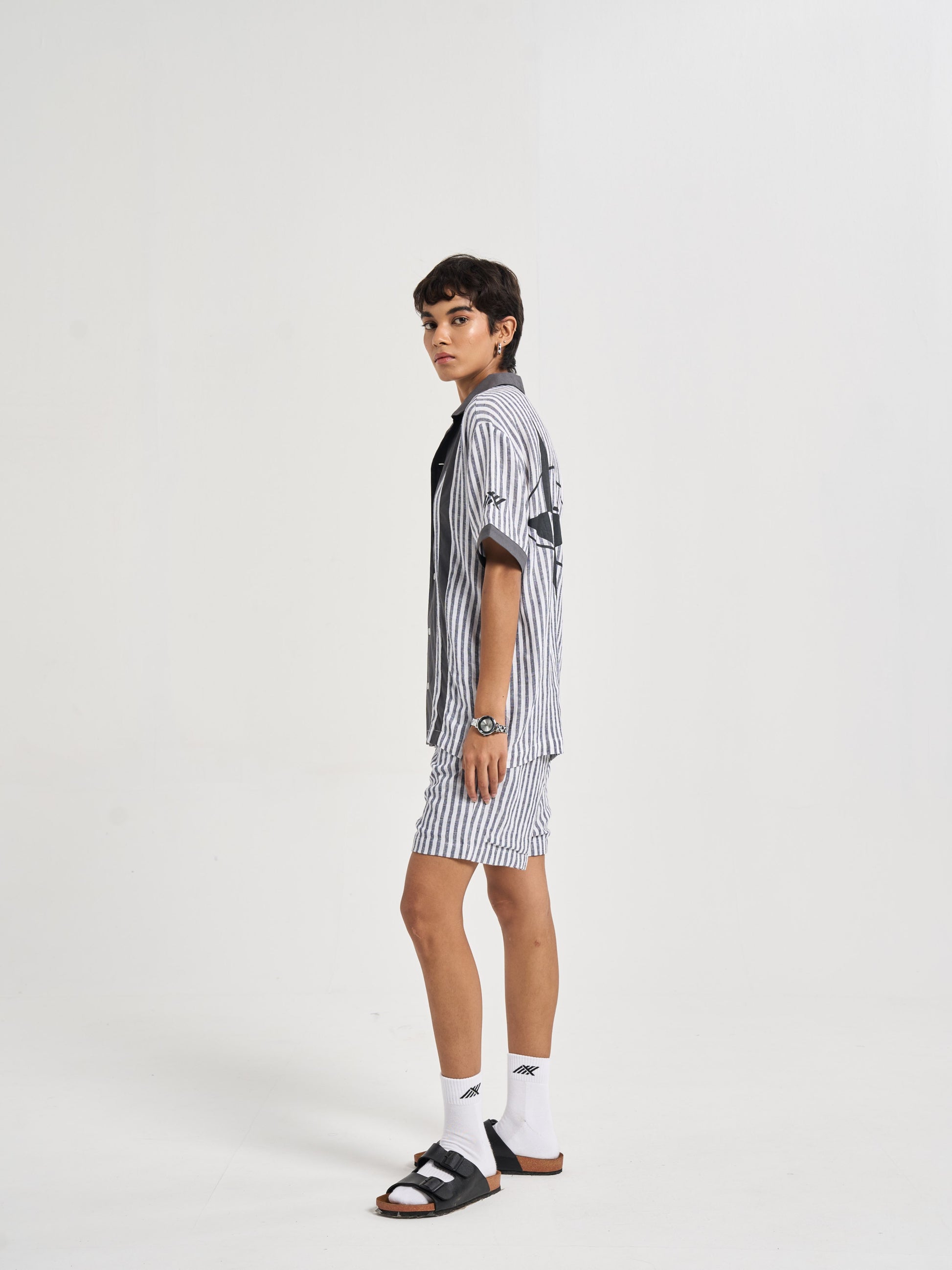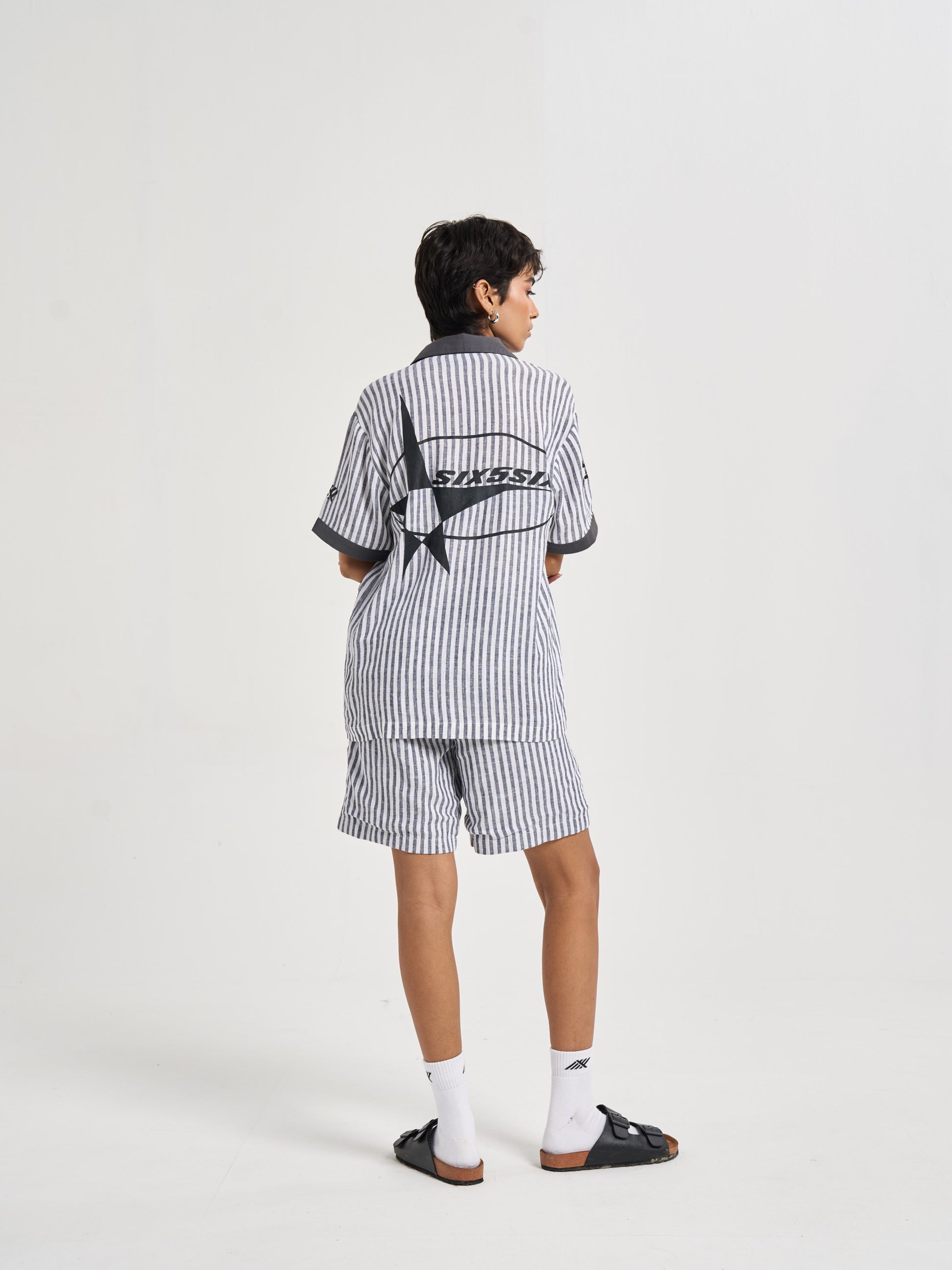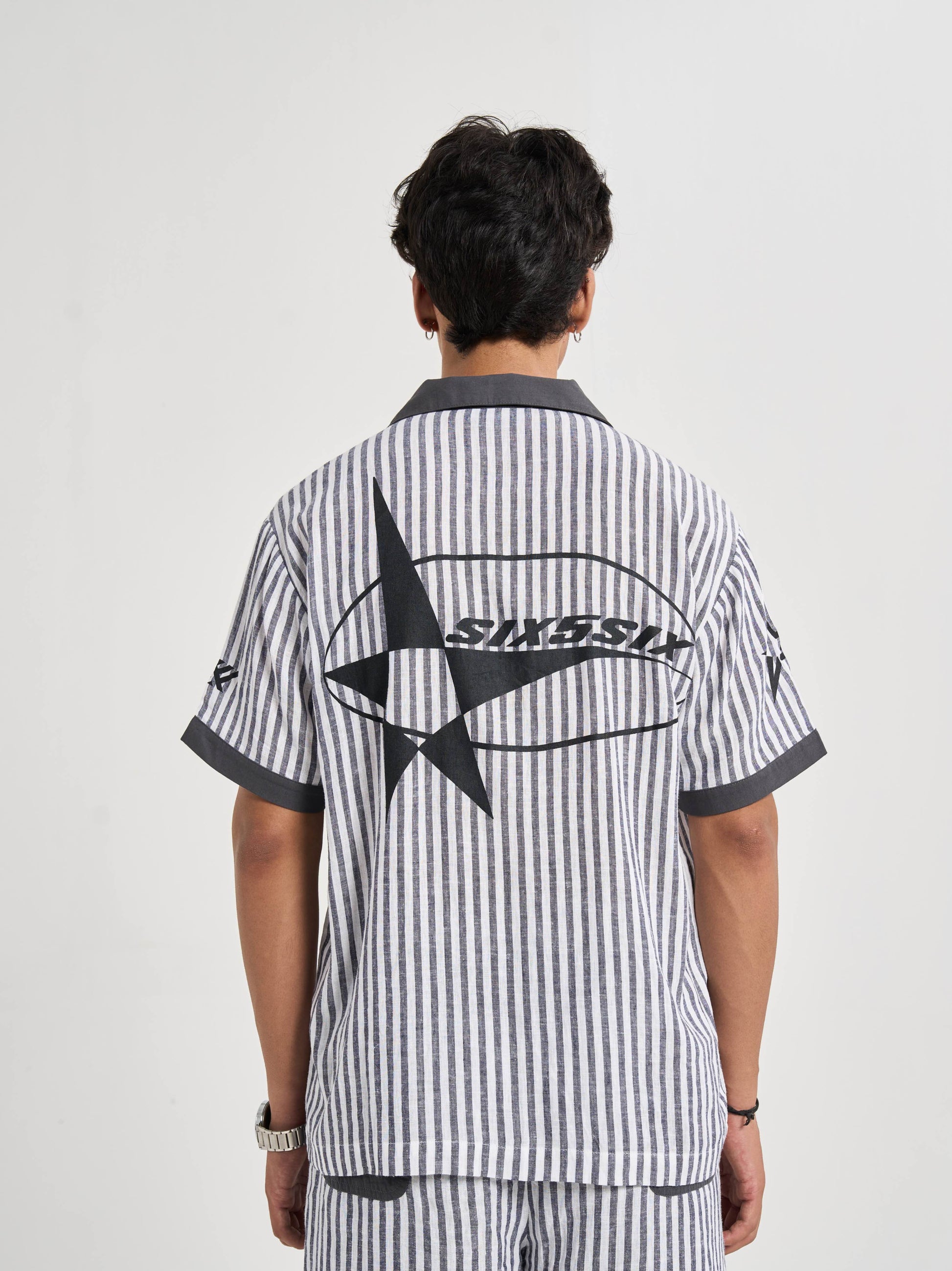 The Trackstar Linen Shirt, made from breathable linen, offers all-day comfort with a bold, race-inspired design. This half-sleeve shirt features vertical stripes with contrast cut-and-sew panels, providing a relaxed fit ideal for casual wear. The back is adorned with an oversized SIX5SIX race-inspired Star graphic, while the sleeves showcase bold racing motifs and branding. A distinctive piece that effortlessly blends style and comfort. .