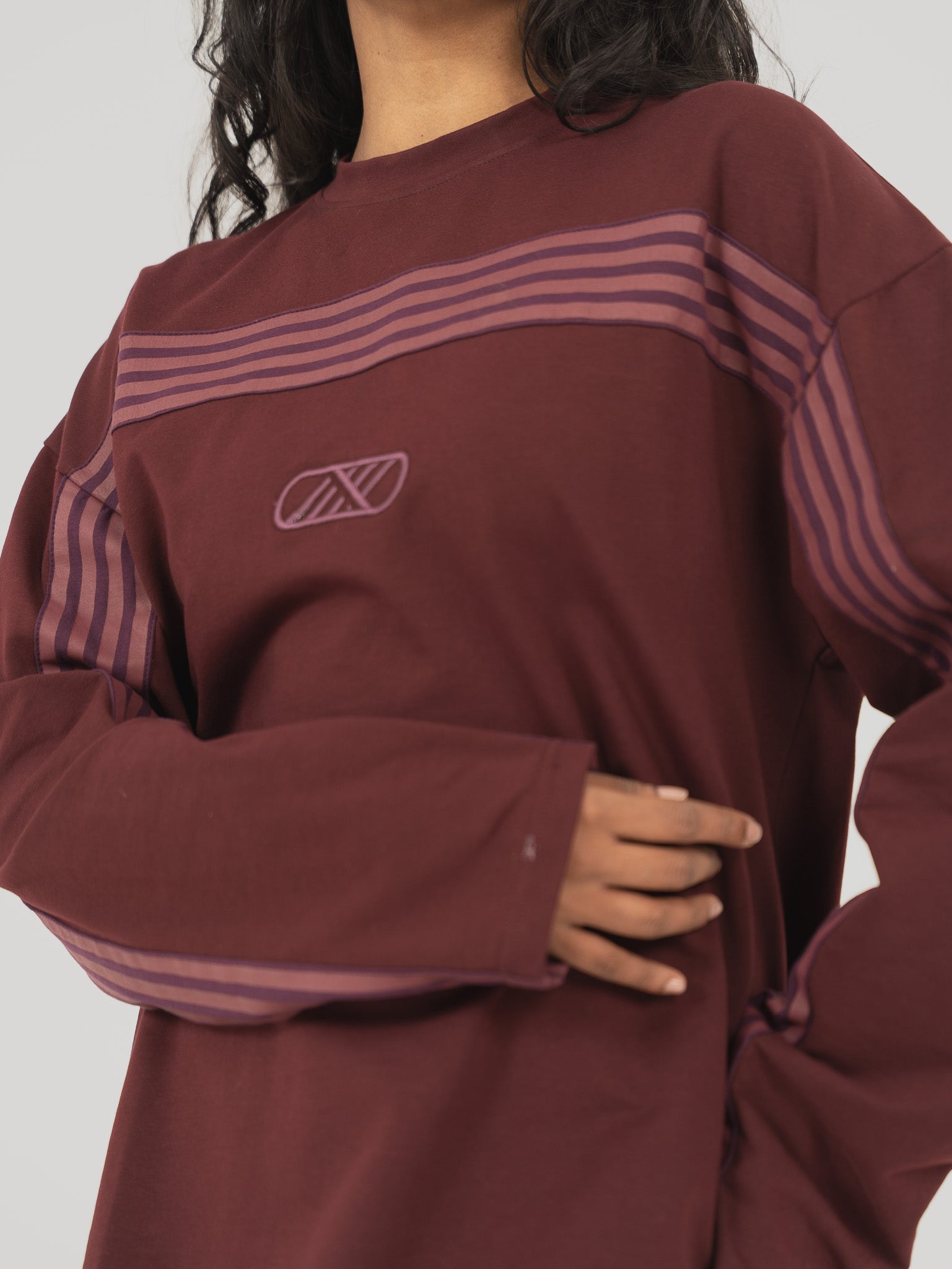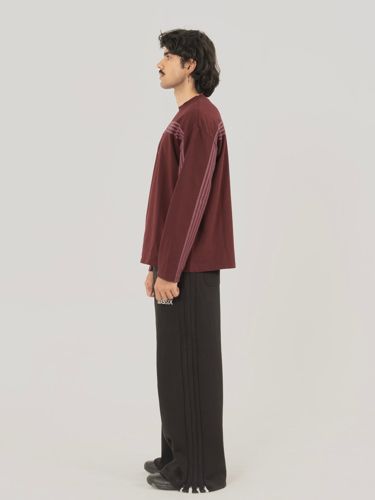 The VelociTee captures the essence of acceleration, that focused stretch of motion that cuts straight through the field. Four parallel cut and sew screen printed stripes run clean across the chest and sleeves, forming the visual of a sprint track; front and back, echoing the linear power that starts and ends in forward momentum. Built from 240 GSM cotton terry, the silhouette blends technical precision with everyday ease. In the maroon variant, the embroidered SIX5SIX monogram sits at the center of the sprint path, symbolizing motion and balance. This is the moment before the burst, where focus meets form, VelociTee embodies the spirit of play at its purest velocity.