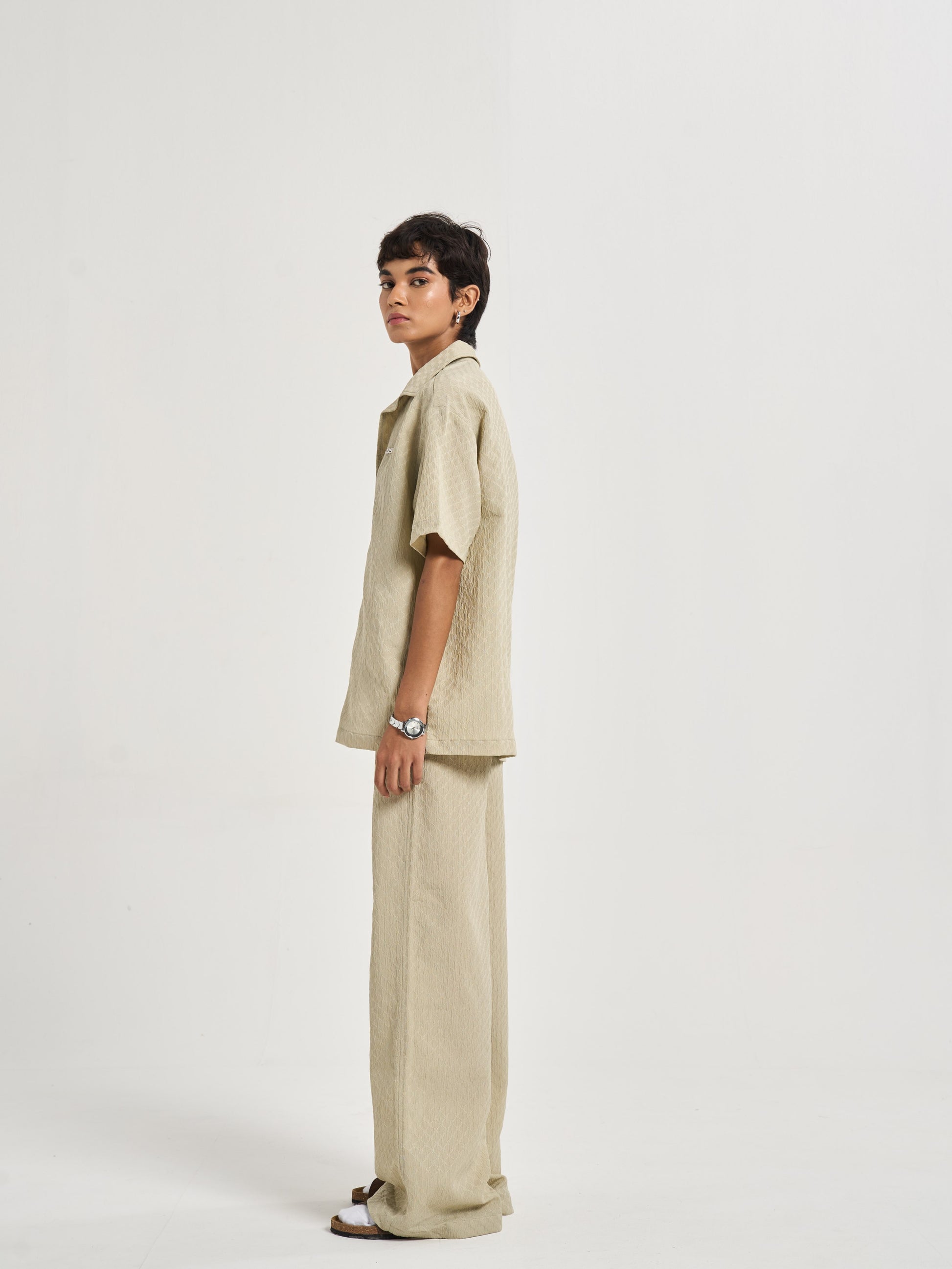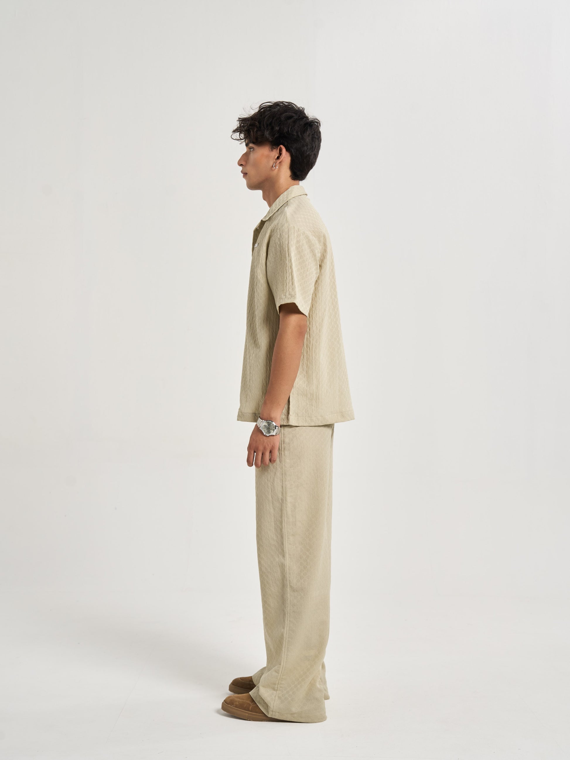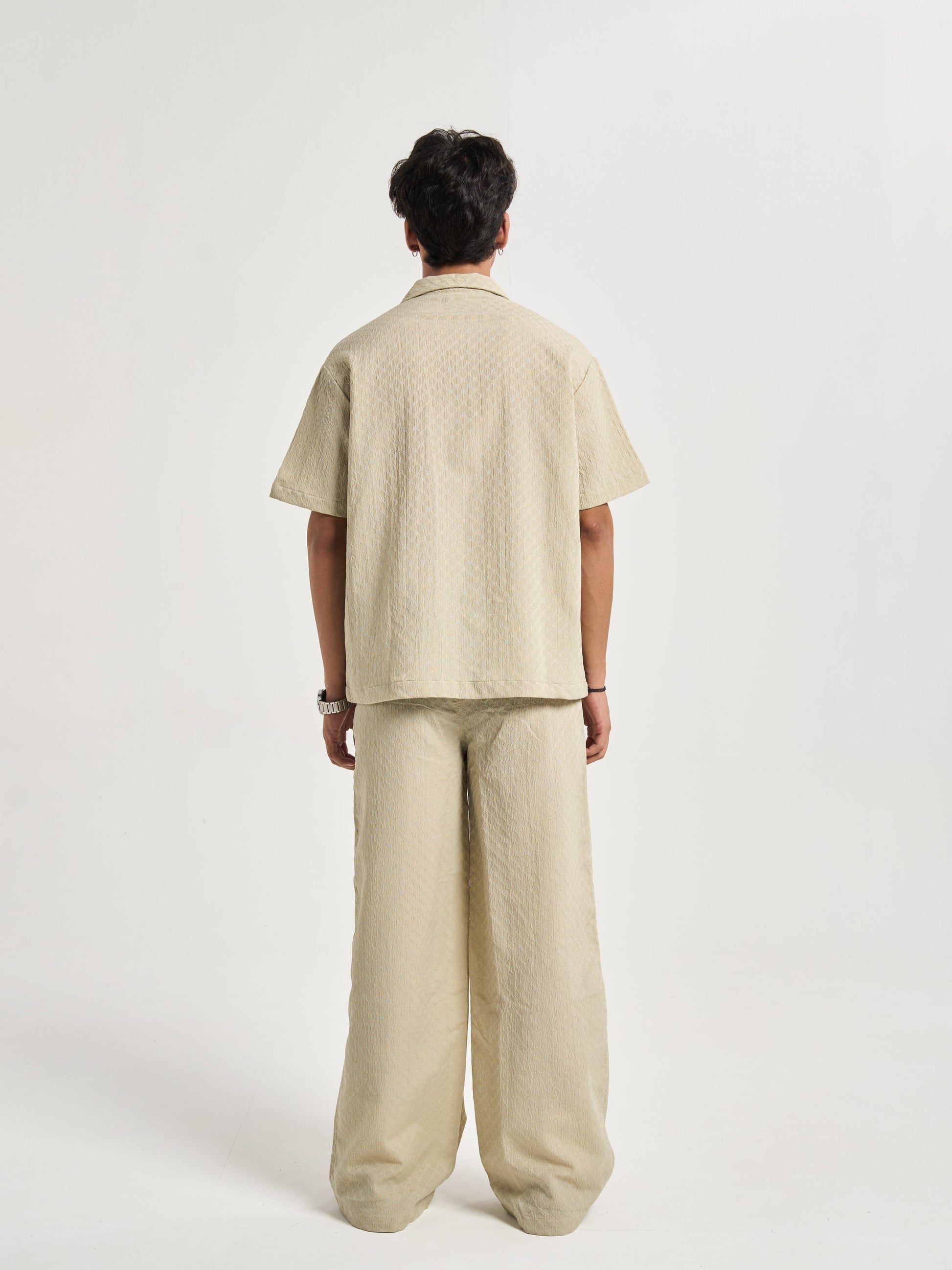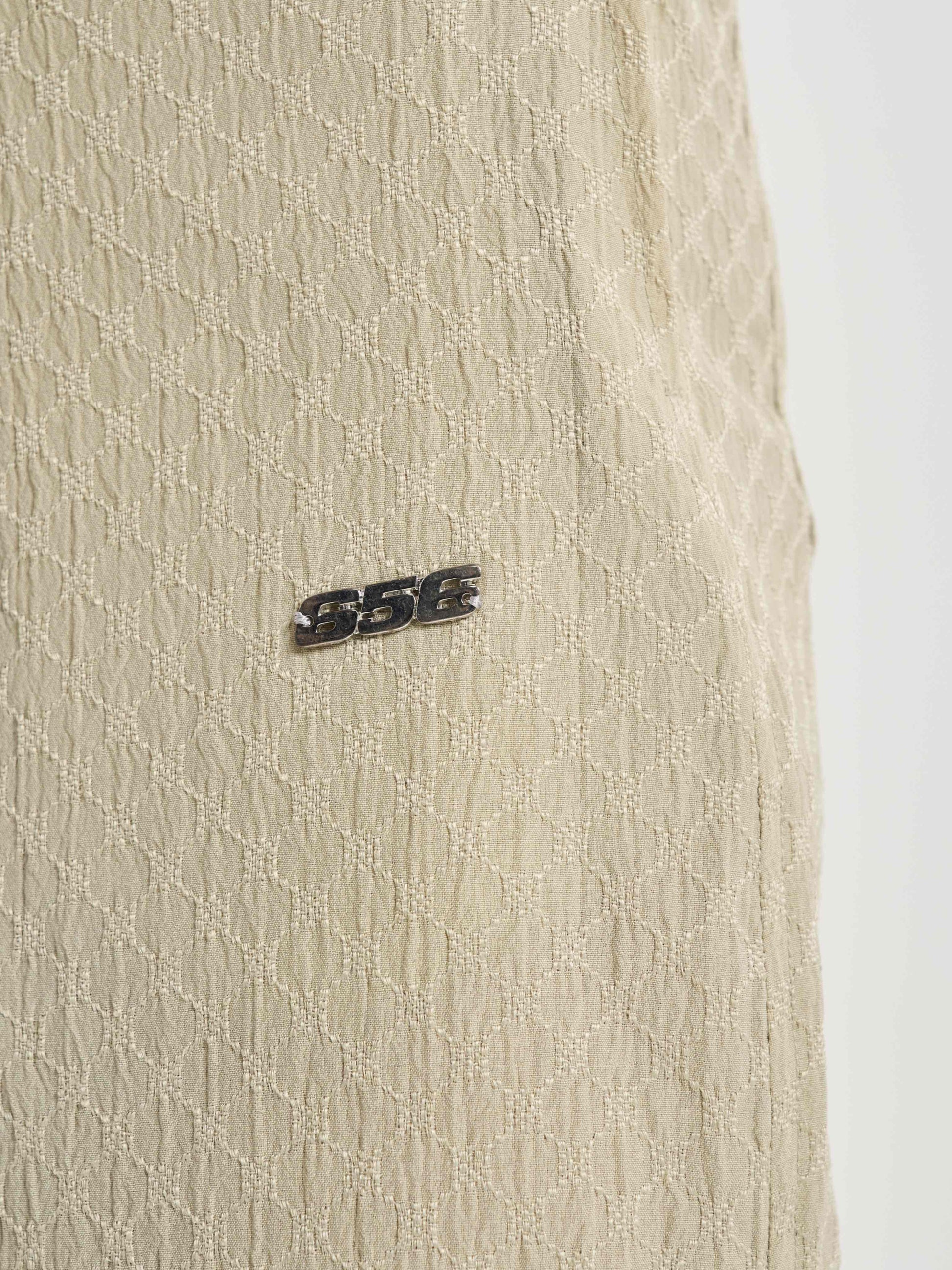Baggy, semi-elasticated trousers cut from the same sand-inspired raised texture fabric, translating the rhythm of grains into a relaxed drape. The metal 656 branding adds polish to the flow, balancing casual comfort with elevated detail. These trousers embody the idea of movement within stillness, simple, versatile, and refined, like the endless repeat of sand patterns at shore or desert. .