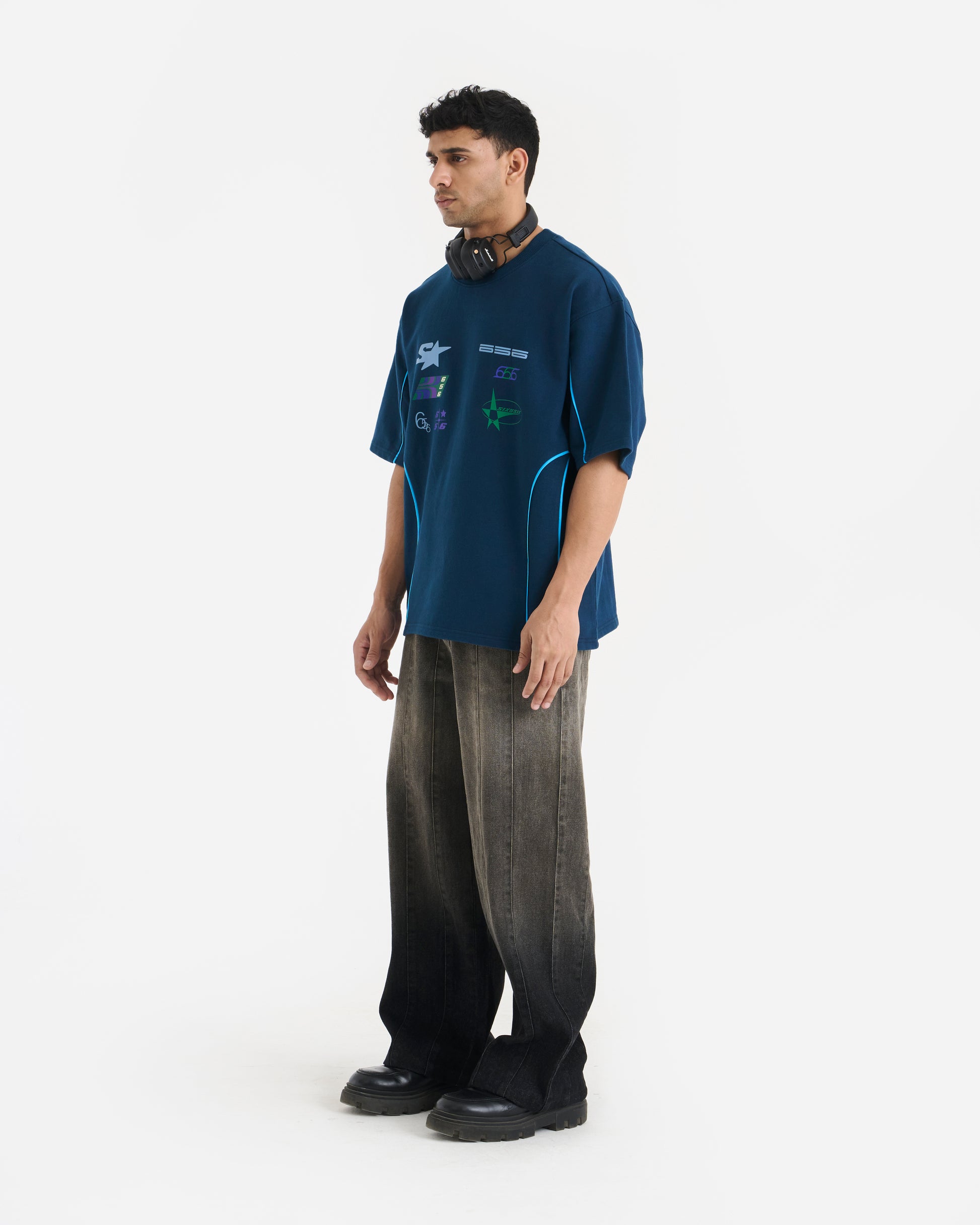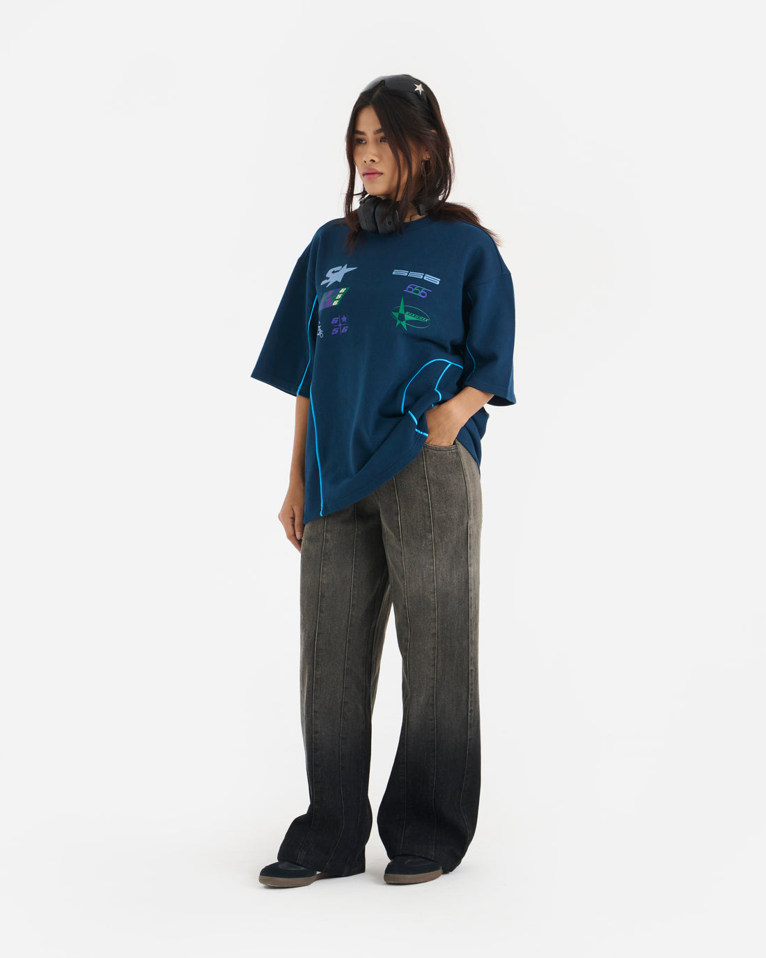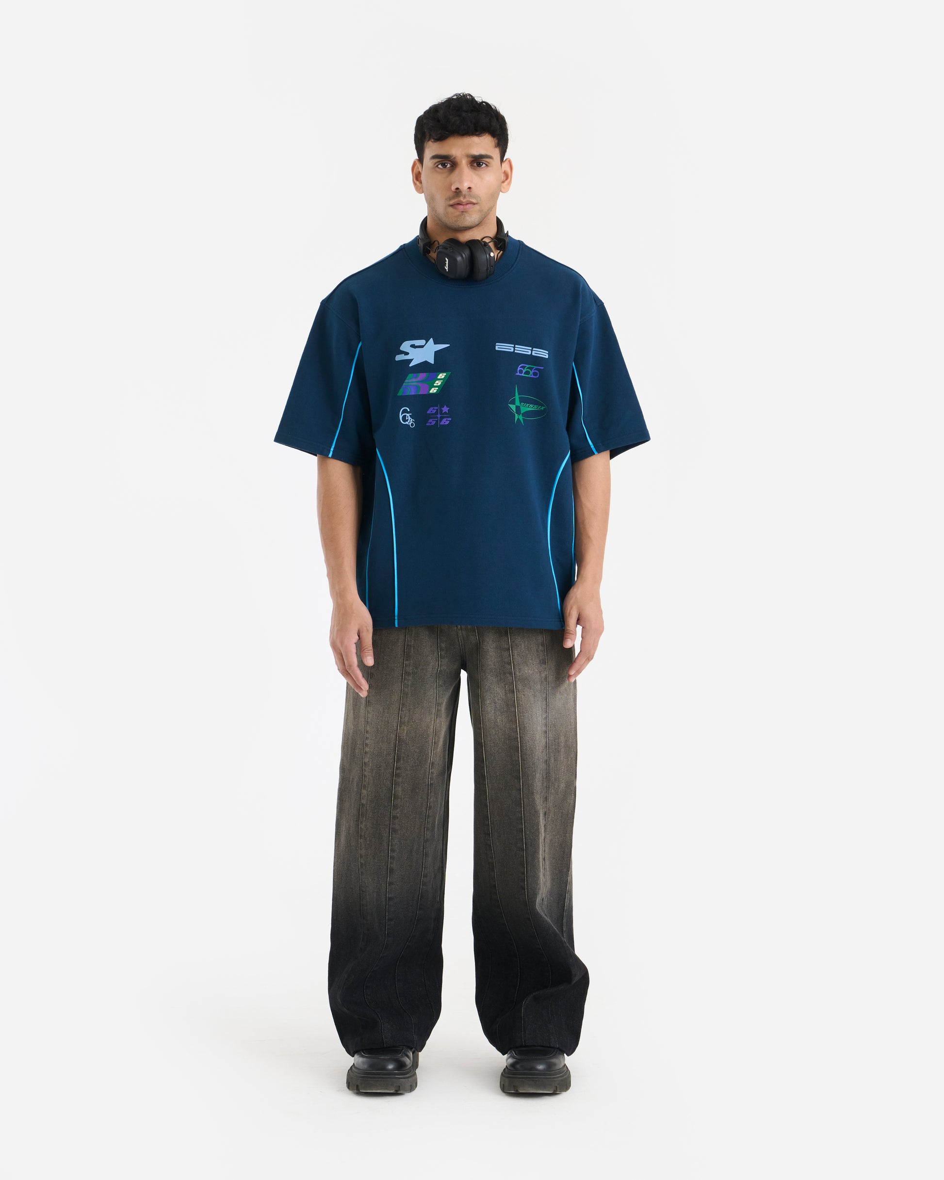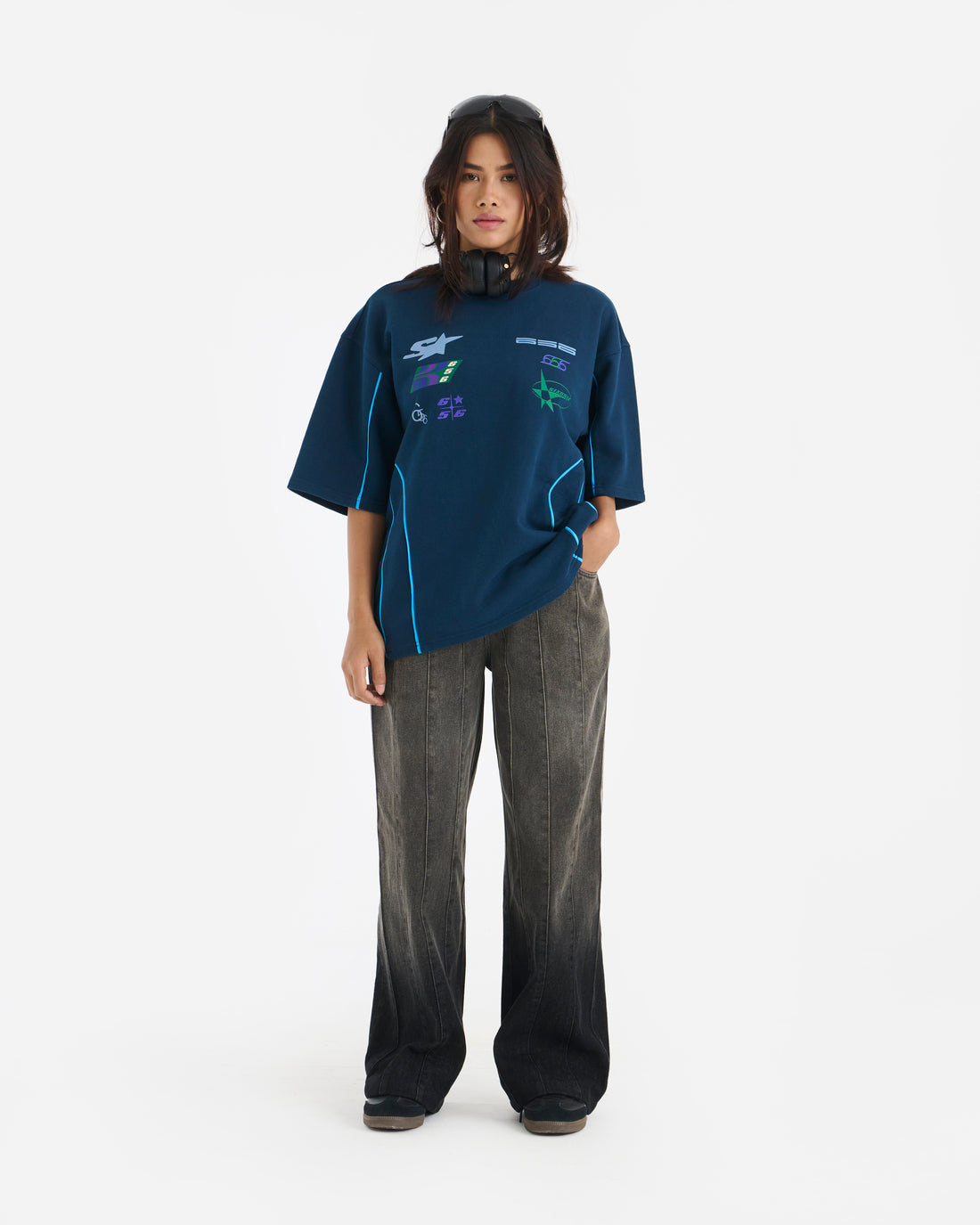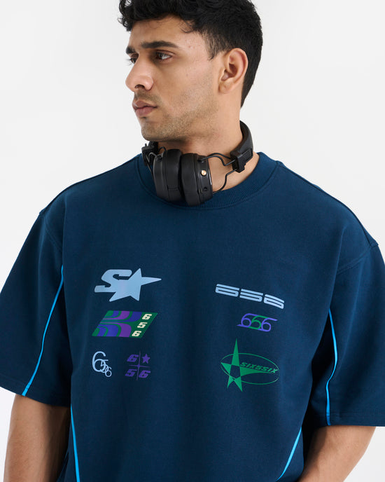 The Livery Oversized Tee brings a Spring-ready take on motorsport aesthetics, featuring contrast piping lines that highlight paneling and movement. SIX5SIX-inspired sponsor-print graphics are placed across the yoke and body, giving it a team jersey energy, while the relaxed silhouette ensures comfort for the season ahead.
