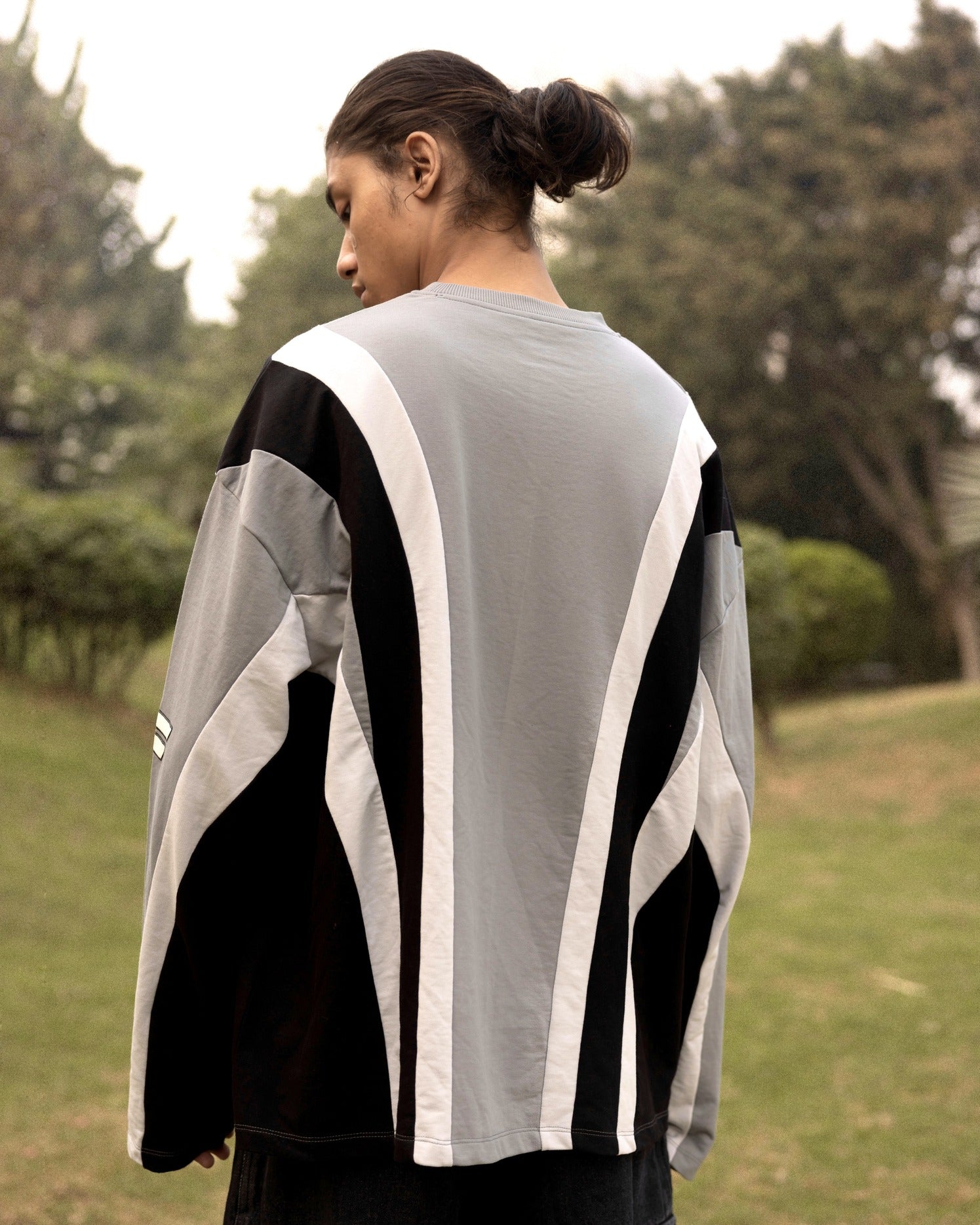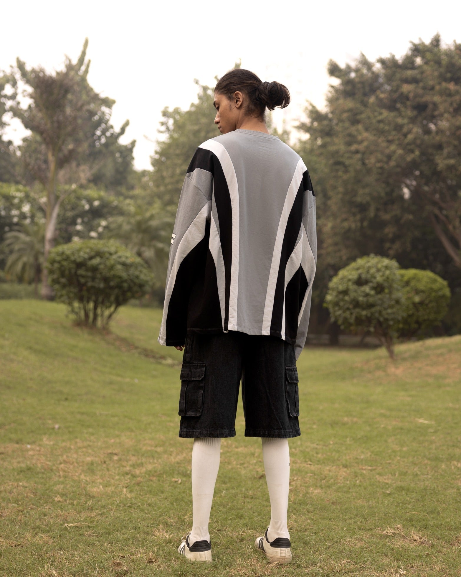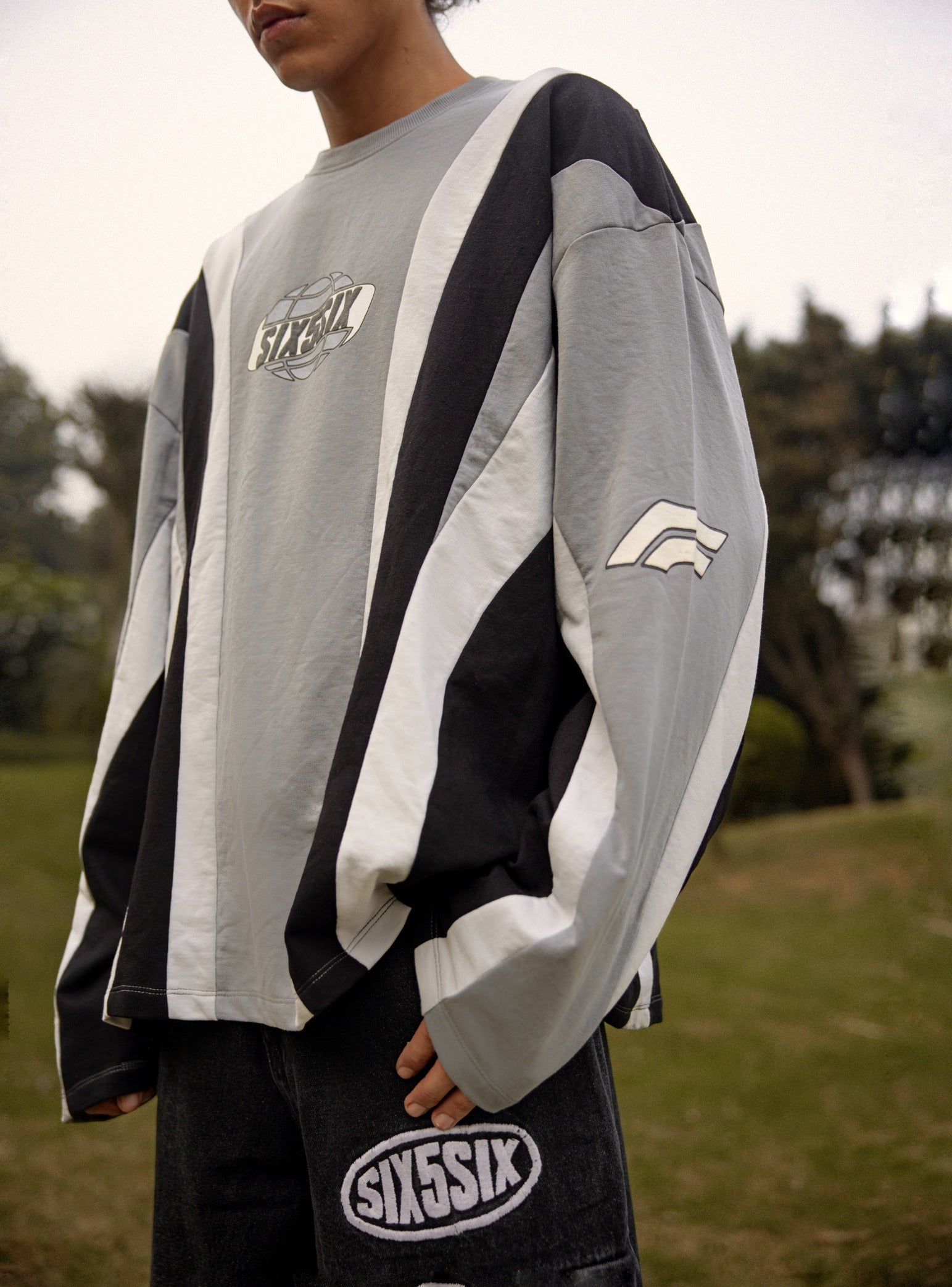 Elevate your fit with this edgy jersey top. Featuring contrast panel design and monochromatic tones, this tee blends retro sportswear with modern streetwear.