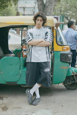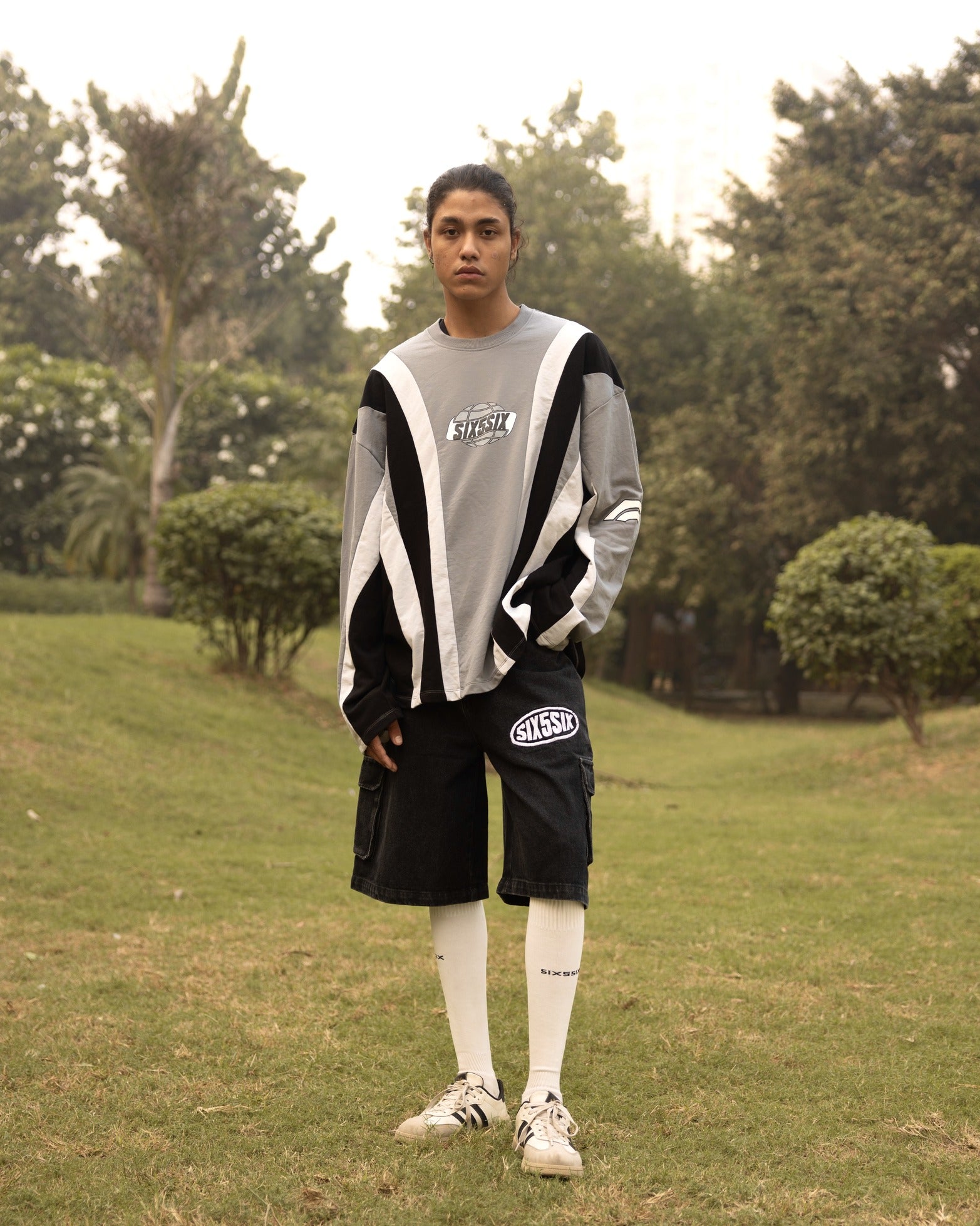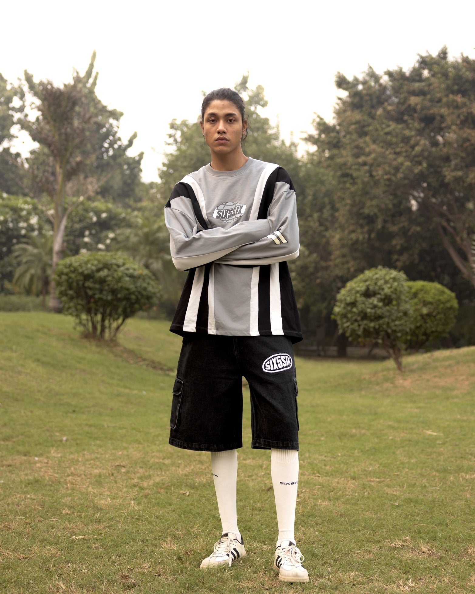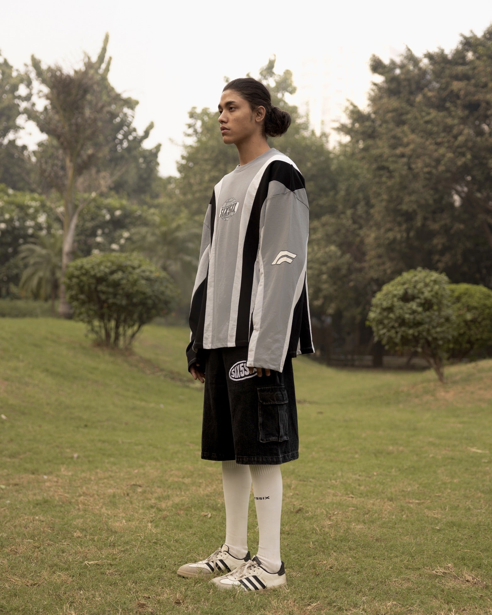Elevate your fit with this edgy jersey top. Featuring contrast panel design and monochromatic tones, this tee blends retro sportswear with modern streetwear.
